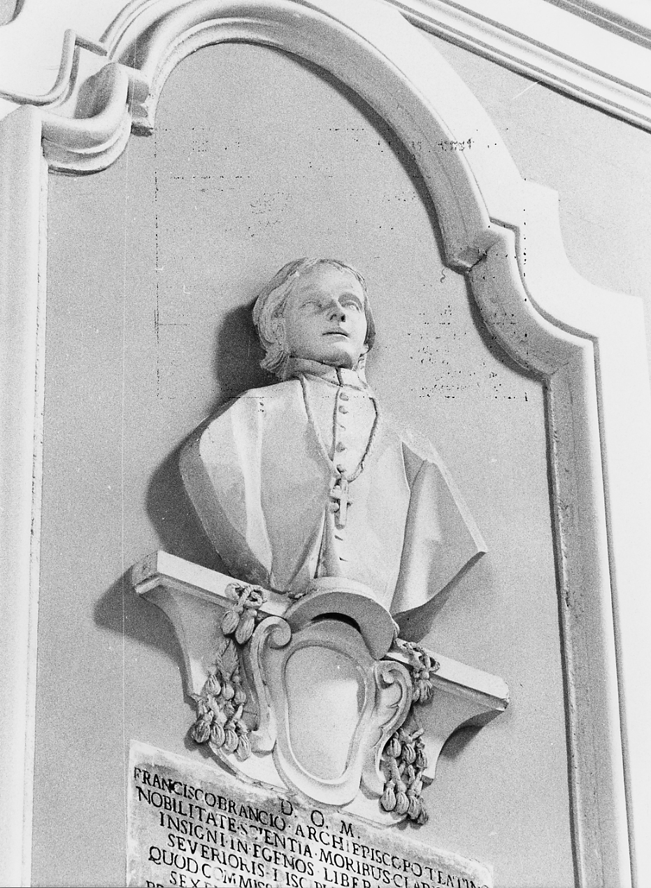 - ISCRIZIONI D. O. M./ FRANCISCO BRANCIO ARCHIEPISCOPO TEATINO/ NOBILITATE SCIENTIA MORIBUS CLARISSIMO/ INSIGNI IN EGENOS LIBERALITATE/ SEVERIORIS DISCIPLINAEVENDICI/ QUOD COMMISSAM SIBI PROVINCIAM/ PRAESUL VIGILANTISSIMUSREXISSET/ TEMPLUMQUE HOCE TEMPORUM INJIURIA/ QUAQAVERSUS FATISCENS PROPEQUE REITURIUM/ E FUNDAMENTIS INSTAURASSET/ INQUE ELEGANTIOREM REDEGISSET FORMAM/ ALOJSIUS DE JUDICE SUCCESSOR/ POSTQUAM S.P.PERFECIT DEDICAVITQUE/ M.P./ M.AE./ VIXIT ANNIS PMXLIII OBIIT VII IDUS JANUARII MDCCLXX - lettere capitali -