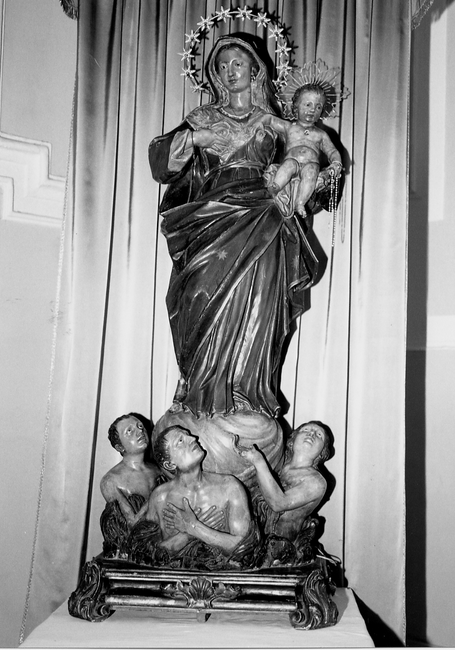 LA MADONNA, A FIGURA INTERA, COLLOCATA SU UNA NUVOLA E' AVVOLTA DA UN AMPIO MANTO AZZURRO. SOSTIENE CON LA MANO SINISTRA IL BAMBINO IGNUDO. IN BASSO, TRA LE FIAMME, FIGURE DI DANNATI