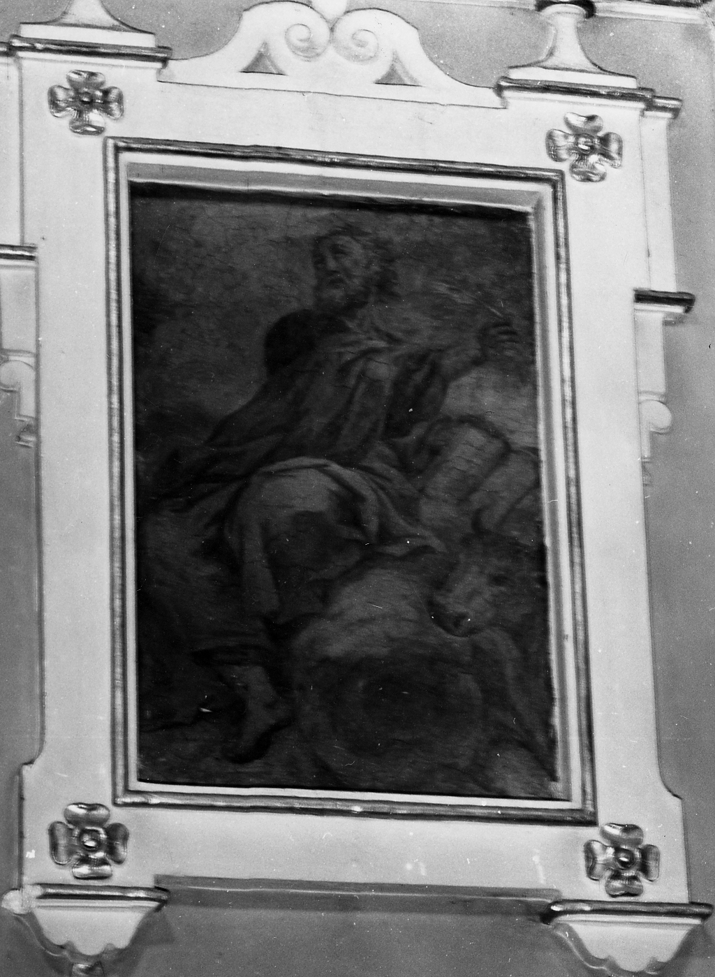 IL SANTO, TRA NUBI, E' RAFFIGURATO NELL'ATTO DI SCRIVERE. AI SUOI PIEDI E'IL TORO