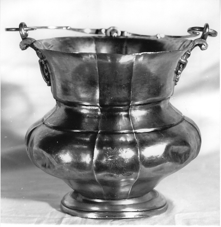 Base circolare madanata e corpo sagomato segnato da nervature sia vertical i che orizzontali. Sulla coppa monogramma della Vergini Assunta