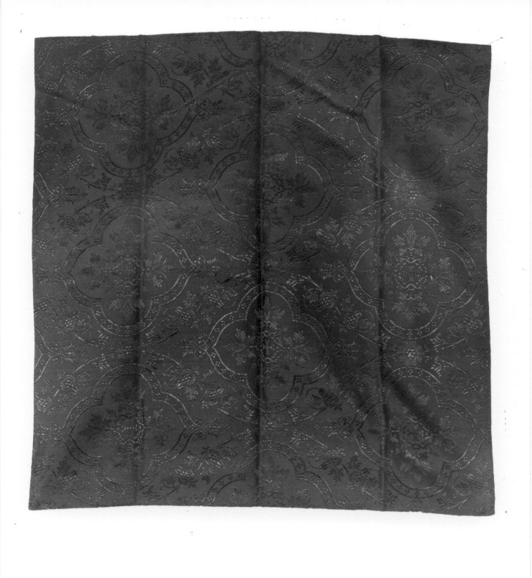 Il velo è bordato da gallone di seta gialla a motivo alternato di croci e grappoli d'uva di cm.1.5