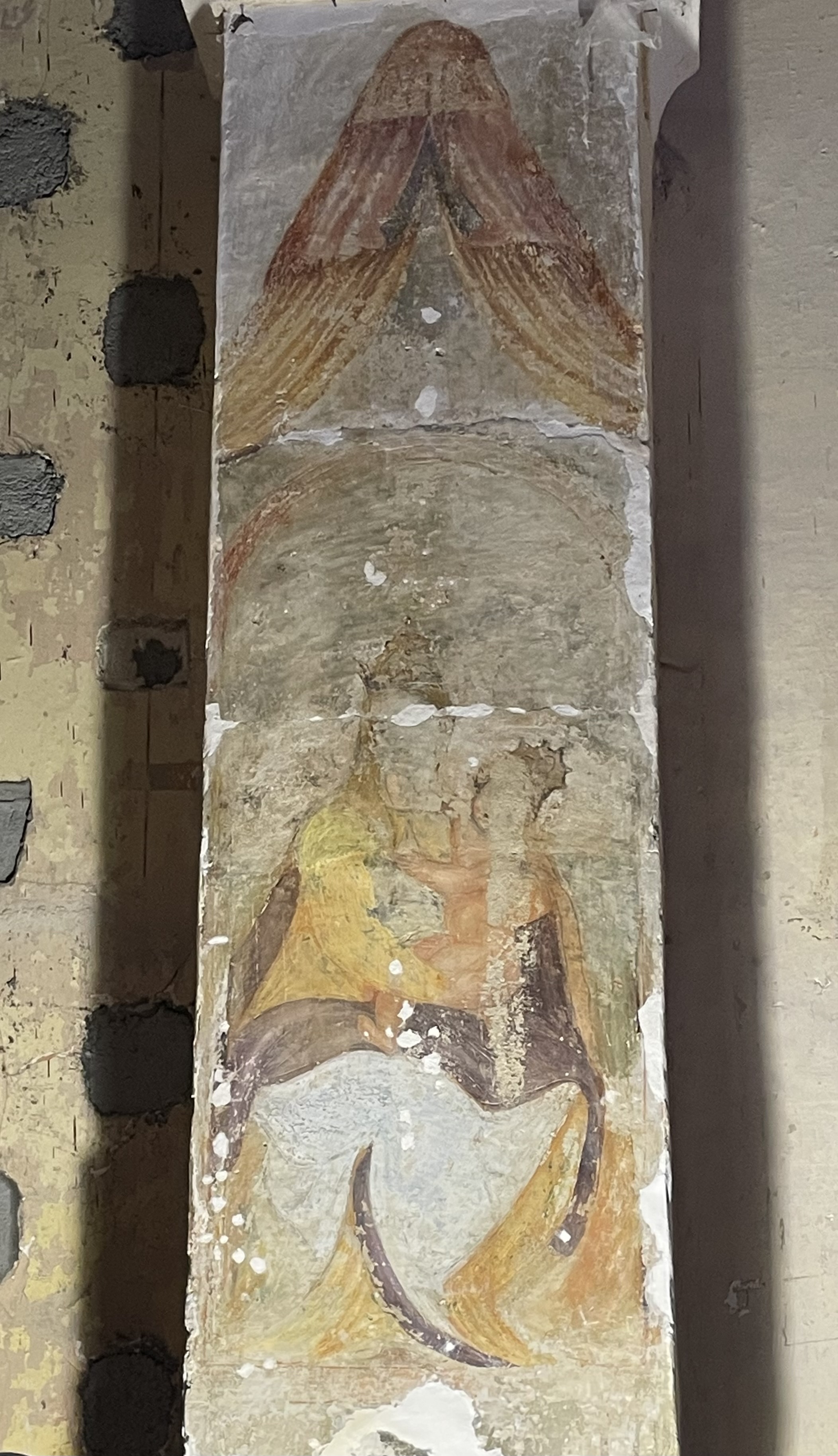Al di sotto di un tendaggio ed un esile arco si inserisce la Madonna che stringe tra le braccia il Bambino. Entrambi i personaggi presentano il capo coronato. La vergine appare seduta, con la testa rivolta verso sinistra, vestita di un manto ocra e mantello marrone. Il Bambino, rivolto verso la madre, afferra con una mano la veste materna e con l'altra il viso, del quale rimangono solamente sparute tracce