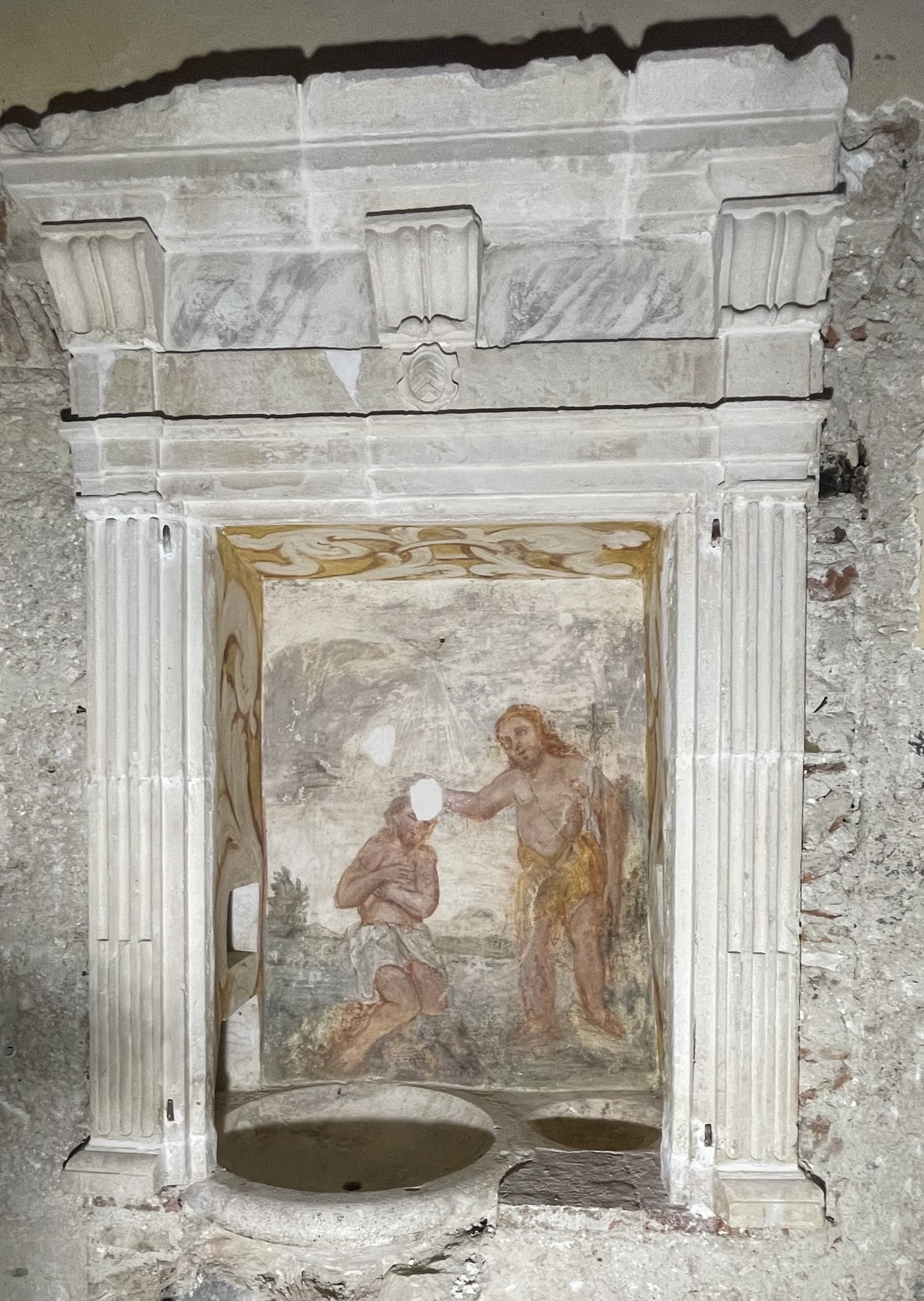 - NOTIZIE STORICO CRITICHE Già il primo edificio di culto paleocristiano, oltre ad assolvere alla funzione sepolcrale, doveva essere adibito a Battistero, come sembra avvalorare la presenza, nell’ampia tribuna a esedra (attuale ambiente adiacente all’angolo destro della facciata), di una profonda vasca rettangolare foderata a cocciopesto, quindi impermeabilizzata allo scopo di contenere l’acqua utilizzata per la celebrazione del rito battesimale. L'edificio fu poi ricostruito nel XII secolo e il fonte battesimale documenta le ultime modifiche realizzate nella chiesa nel corso del XVI secolo, quando nell'aula furono aperte delle nicchie decorate ad affresco sulla parete sinistra e annessi altri locali costruiti sul fianco destro, a ridosso della sagrestia. Il fonte battesimale fu dunque realizzato a spese della comunità, mentre le decorazioni pittoriche delle nicchie aggiunte sul fianco sinistro della chiesa dopo l’espansione laterale di metà Cinquecento sono da considerare, al contrario, espressione del mecenatismo privato