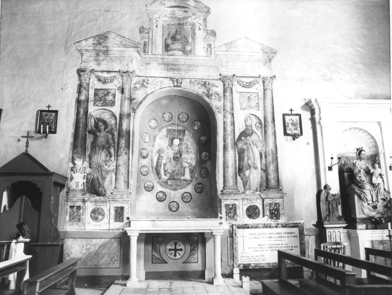 Dipinto centrale raffigurante la Madonna del Rosario, dipinto a destra con S. Erasmo, dipinto a sinistra con l'Angelo. Nella lunetta la figura dell'Onnipotente