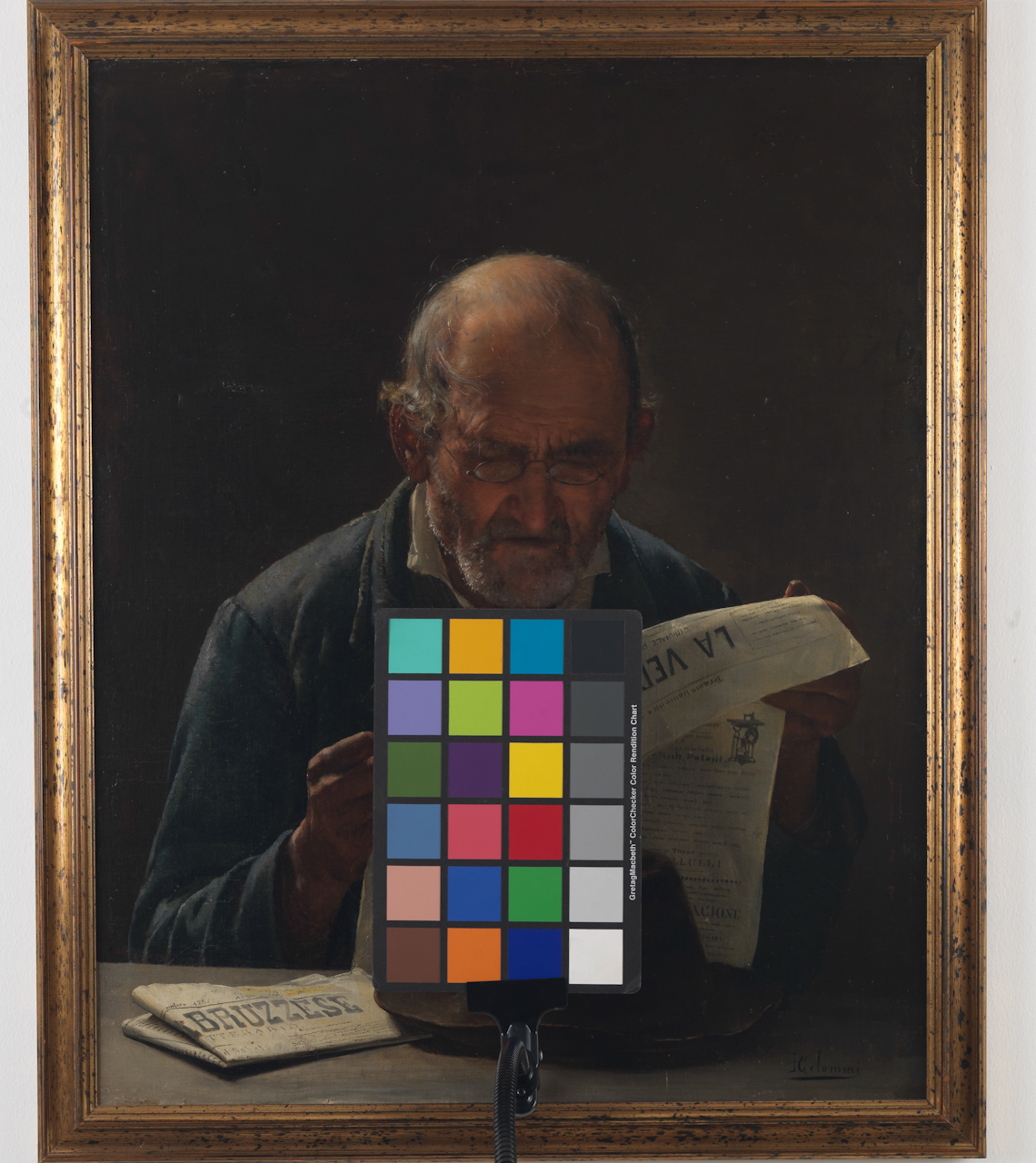 La tela ritrae un uomo anziano seduto al tavolo mentre legge il quotidiano "La Vedetta" sul quale compare la data del 3 giugno 1888. Sul tavolo in primo piano sono poggiati il cappello con tesa e un altro giornale locale ripiegato con la data 1887. L'uomo indossa una camicia bianca e una giacca blu. Il fondo scuro è neutro, una luce proveniente da sinistra illumina il volto corrucciato e intento nella lettura, mettendo in evidenza i capelli e la barba grigi, i piccoli occhiali da vista, le rughe sulle sopracciglie. Il bagliore colpisce i due giornali, fedelmente riprodotti fin nelle singole scritte