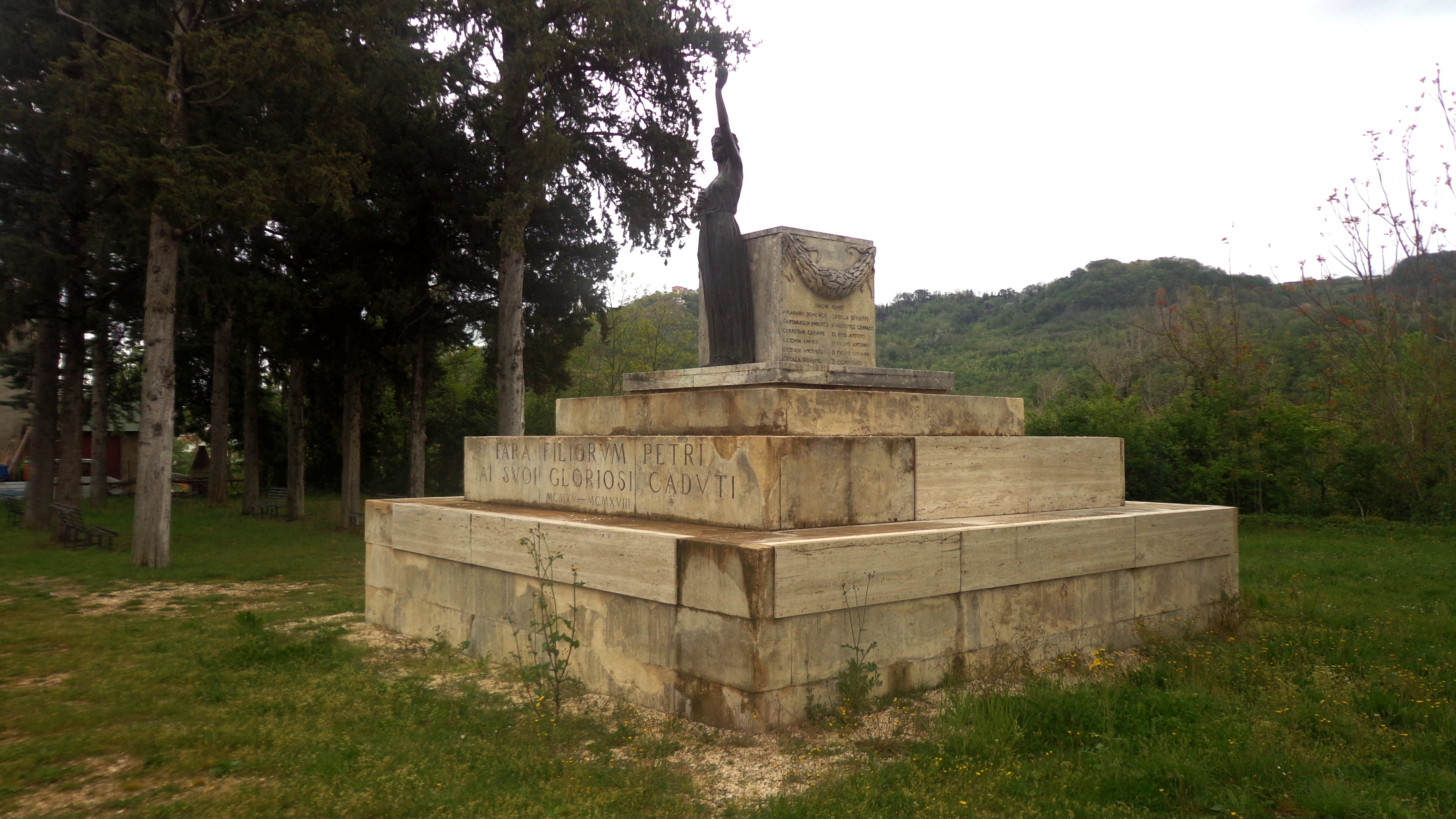 - NOTIZIE STORICO CRITICHE Il monumento venne inaugurato il 28 agosto del 1927 durante l’amministrazione del Sindaco Amato de Matteis e fu collocato nella pineta in cui sorse il Parco della Rimembranza di Fara Filiorum Petri, in via Madonna. I documenti conservati nell’archvio di stato di Chieti testimoniano l’attenzione che sia il De Matteis, sia il suo successore, concessero al monumento e al parco, con continui interventi di manutenzione. I lavori di restauro effettuati nel 2012 hanno coinvolto l’intero basamento. Sono state rimosse le lastre riportanti i nomi dei caduti che erano collocate sopra l’incisione in caratteri romani “Fara Filiorum Petri Ai suoi gloriosi caduti”, poi spostate su un muro costruito all’interno del Parco a pochi metri di distanza dal monumento