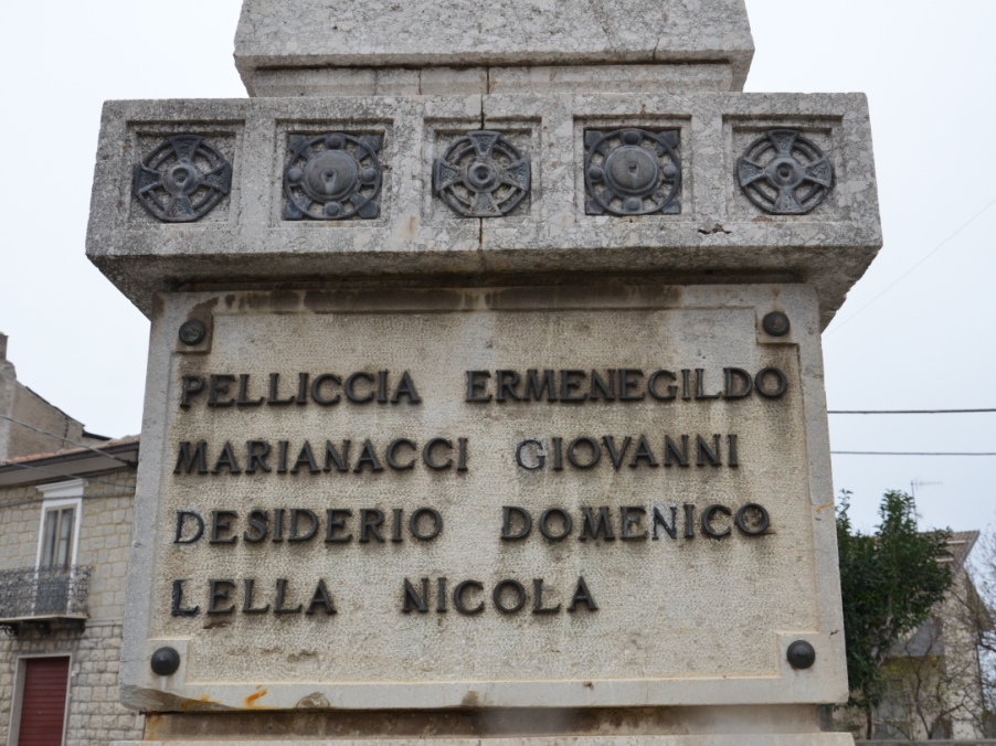 - NOTIZIE STORICO CRITICHE La tradizione orale tramanda che i lavori per la realizzazione del Monumento iniziarono nel 1924 e si completarono nel 1926. L’opera fu eseguita dall’allora capo-mastro Pelliccia Germano, nato il 05/06/1860, insieme a Pelliccia Enrico fu Giacomo, nato il 09/04/1868. Collaborarono alla realizzazione dell’opera dei giovani apprendisti intenti ad imparare l’arte della lavorazione della pietra. Per i lavori meno duri, come il trasporto di pietrisco, venne impiegata anche la manovalanza femminile. La pietra per tale costruzione proveniva da una vecchia cava situata in località Cantone e i blocchi di pietra grezza venivano trasportati da grossi buoi su carri senza ruote