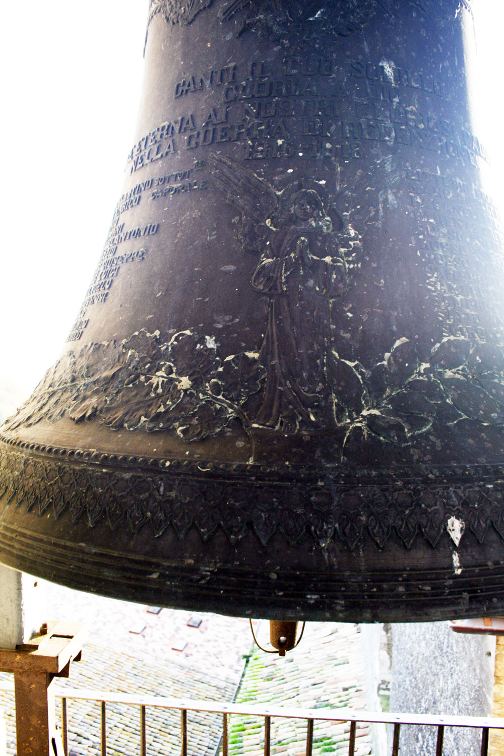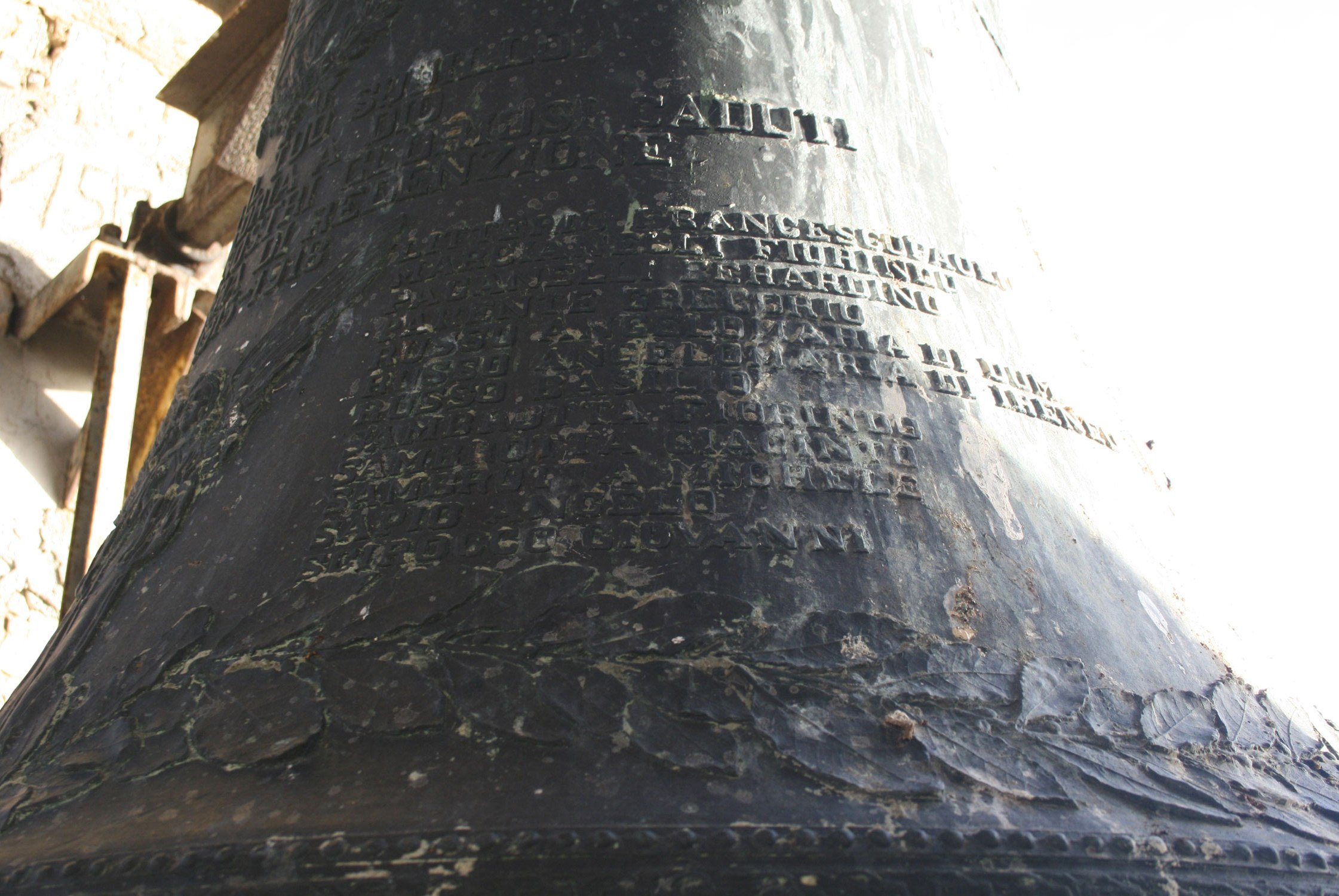 - ISCRIZIONI nella parte centrale della campana, al di sopra dell'angelo - CANTI IL TUO SQUILLO / GLORIA A DIO / PACE ETERNA AI NOSTRI GLORIOSI CADUTI / NELLA GUERRA DI REDENZIONE / 1915 – 1918 - stampatello maiuscolo - a fusione - italiano