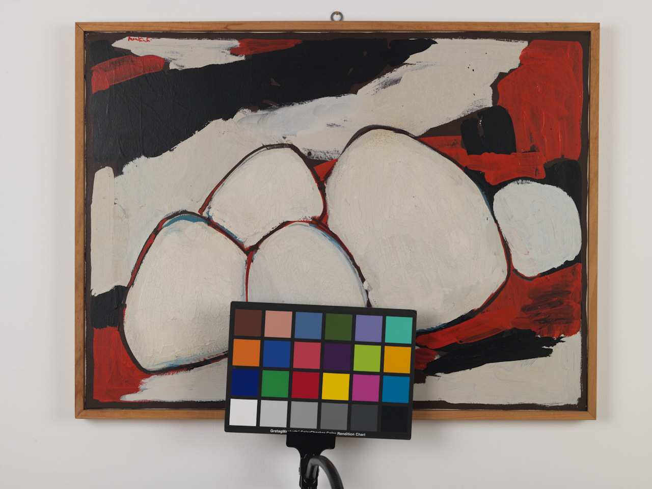 La tela, dal titolo 'Paesaggio', presenta cinque promontori di diverse grandezze dipinti di bianco. Intorno, pennallate di rosso e di nero fanno da sfondo. Le forme delle motagne sono restituite mediante per masse sintetiche