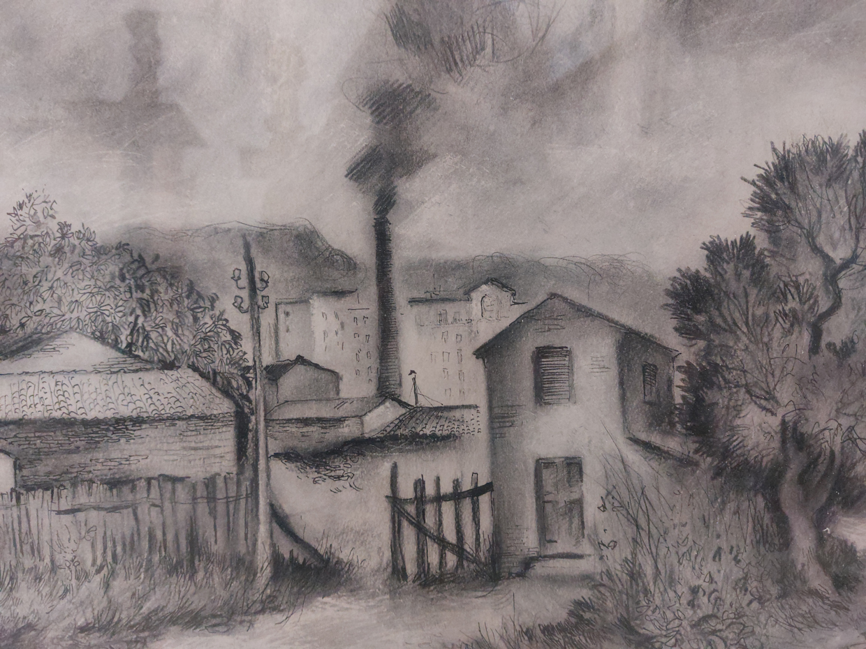 Nel disegno è raffigurata una veduta di periferia in una zona di campagna. In primo piano si vedono una staccionata, un edificio e un albero. Oltre la staccionata una fabbrica, pali elettrici e altre costruzioni
