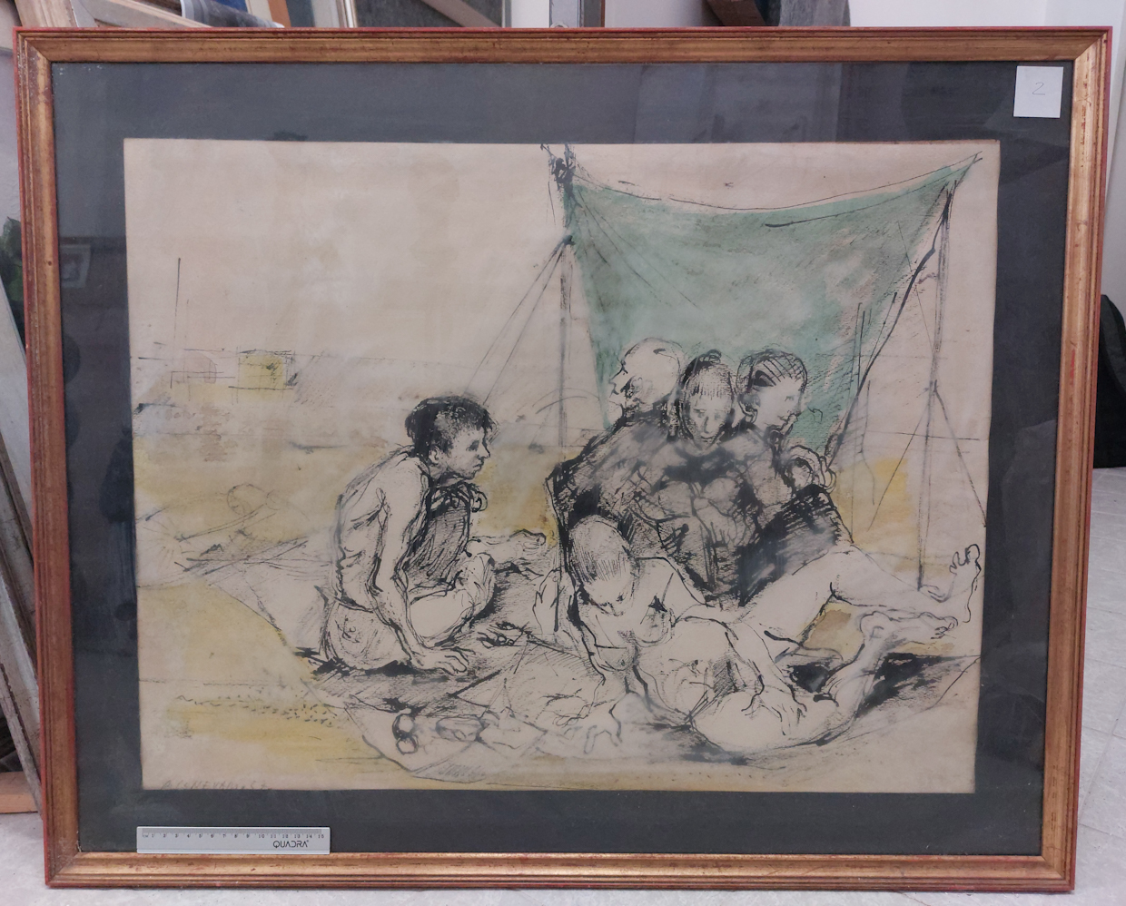L'opera ritrae un gruppo di cinque figure sedute su un telo, in un contesto all'aperto, forse una spiaggia. In primo piano sono un ragazzo di profilo e una donna nuda con la gambe divaricate. Dietro di loro le restanti tre figure, con alle spallle un telo verde chiaro. Il segno grafico è veloce e espressivo
