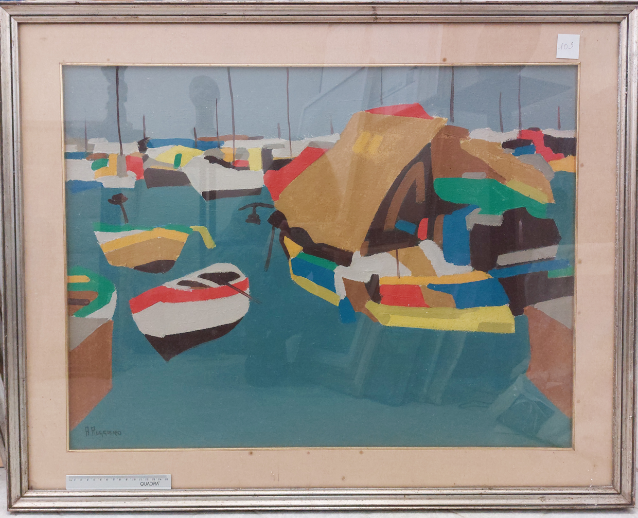 Il dipinto raffigura una veduta con barche attraccate al molo. Il blu intenso dell'acqua contrasta con i colori vivi e squillanti delle imbarcazioni. Le pennallate, compatte, restituiscono le forme attraverso le varie campiture cromatiche
