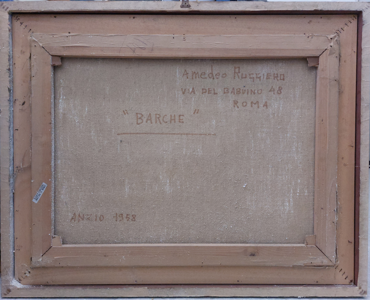 - NOTIZIE STORICO CRITICHE L'opera è stata acquisita con il Premio Avezzano del 1958, IX Mostra Nazionale delle Arti Figurative (16-31 agosto, Palazzo Liceo, Avezzano). In quell'occasione l'artista espose 'Barche' e 'Pescatori della domenica'. Il Premio fu istituito nel 1949 per la volontà di un gruppo di artisti fondatori del GAM (Gruppo Artistico Marsicano), con il titolo originario di I Mostra Marsicana di Pittura (4-11 settembre 1949). Solo a partire dalla VII edizione (1957) verrà designato con il titolo Premio Avezzano. Amedeo Ruggiero nasce a Tunisi nel 1912 e si trasferisce in Italia lavorando principalmente nella capitale. Nelle sue opere affronta spesso il tema del paesaggio. Partecipa alle più importanti rassegne nazionali e prende parte a diverse edizioni del Premio Avezzano
