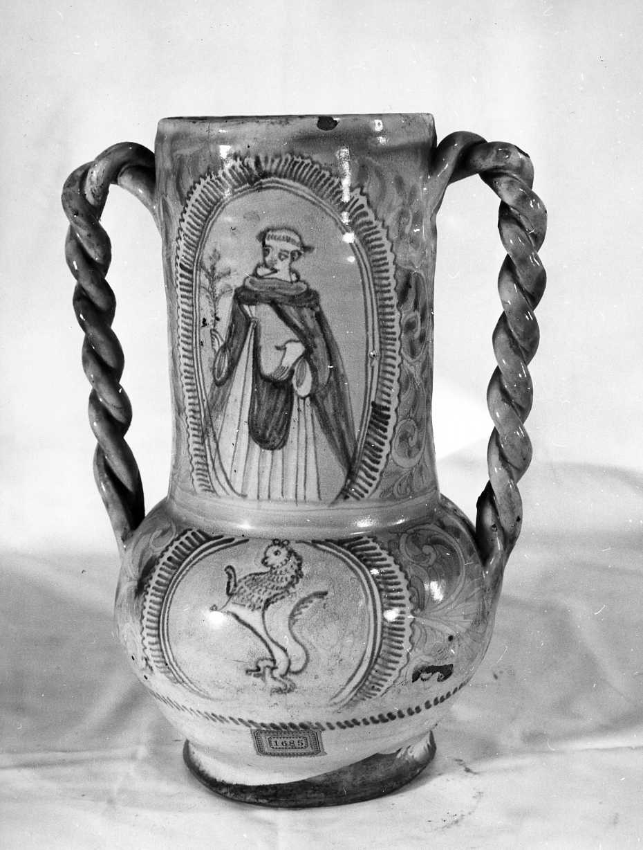 Vaso biansato caratterizzato da due manici a tortiglione, decorato su entrambe le facce. Da un lato un santo non identificabile con un ramoscello in mano dentro una mandorla. Al di sotto in un medaglione un leone rampante. Sull'altra faccia, in contrapposizione alla figura del Santo, una donna di profilo. Sotto un motivo di foglie e fiori stilizzati