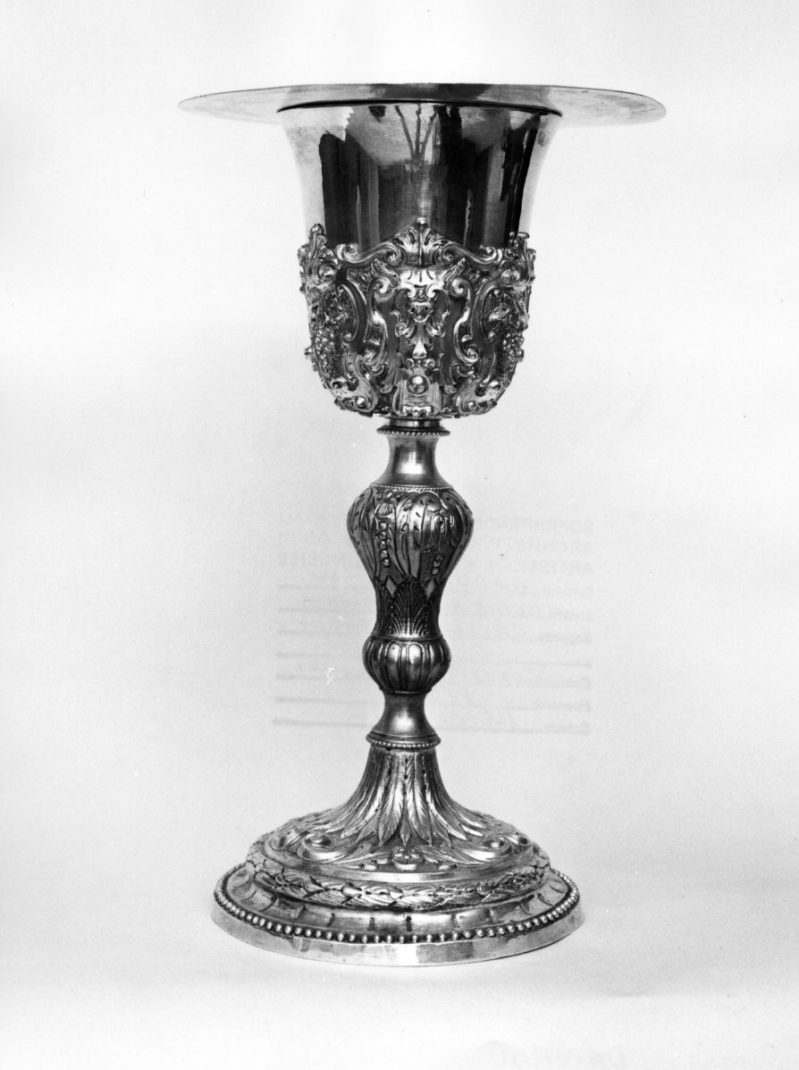 Calice in argento a fusione, sbalzato e cesellato. Il calice è caratterizz ato da piede circolare rigonfio decorato da un fregio e da motivi vegetali ; nodo sagomato con decorazione a palmette, a baccelli e fregi; nel sottoc oppa tralci d'uva racchiusi in cartelle si alternano a motivi di volute e gigli stilizzati. Vi è anche una patena liscia