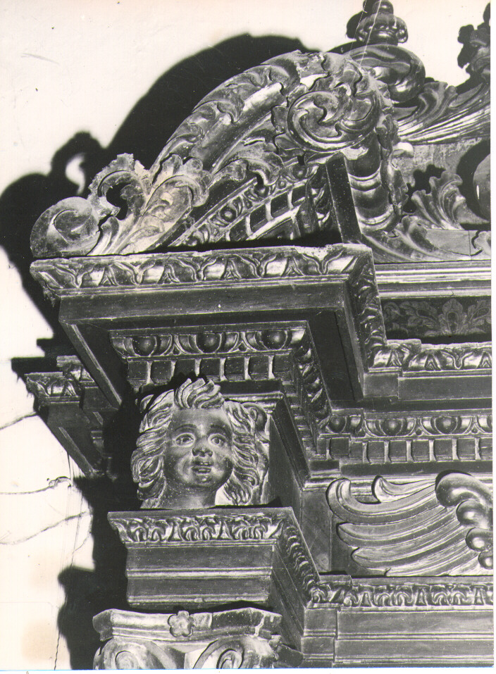 Dossale spartito da quattro pilastri su cui impostano delle colonne tortili intagliate a motivi foliari. Capiletti corinzi. Alle estremità frammenti di architrave e timpani triangolari spezzati. La superfice tra le colonne accoglie ai due lati, due nicchie con statua e riquadri dipinti; al centro un grande pannello intagliato accoglie una nicchia con la statua di Gesù. Il ricco fastigio rettangolare, con un medaglione dipinto, è ornato lateralmente da volute foliari,come i finachi delle colonne laterali