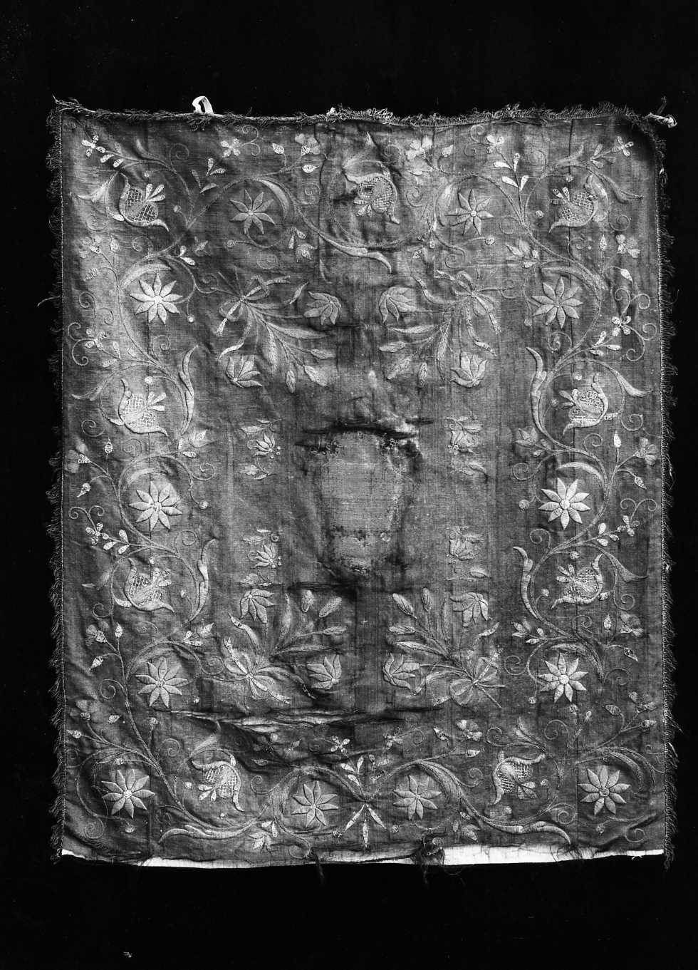 - NOTIZIE STORICO CRITICHE Gli stendardi facevano parte dell'arredo processionale della Confraternita di S. Nicola da Tolentino e venivano usati dai confratelli in occasione delle maggiori festività. Lo stenardo rettangolare ricamato con gusto di semplice eleganza vicino a quello della confraternita dell'annunciata dello stesso Oratorio, si può datare agli utlimi anni del secolo XVIII, mentre l'altro co disegno molto più stilizzato è da ritenere del secolo XIX