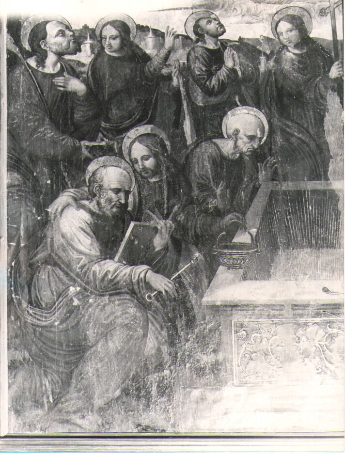 Personaggi: Assunta; Cristo; apostoli; angeli. Allegorie-simboli: disco solare; serpente. Architetture: sarcofago. Paesaggi: colline; paese. Oggetti: navicella; secchiello e aspersorio