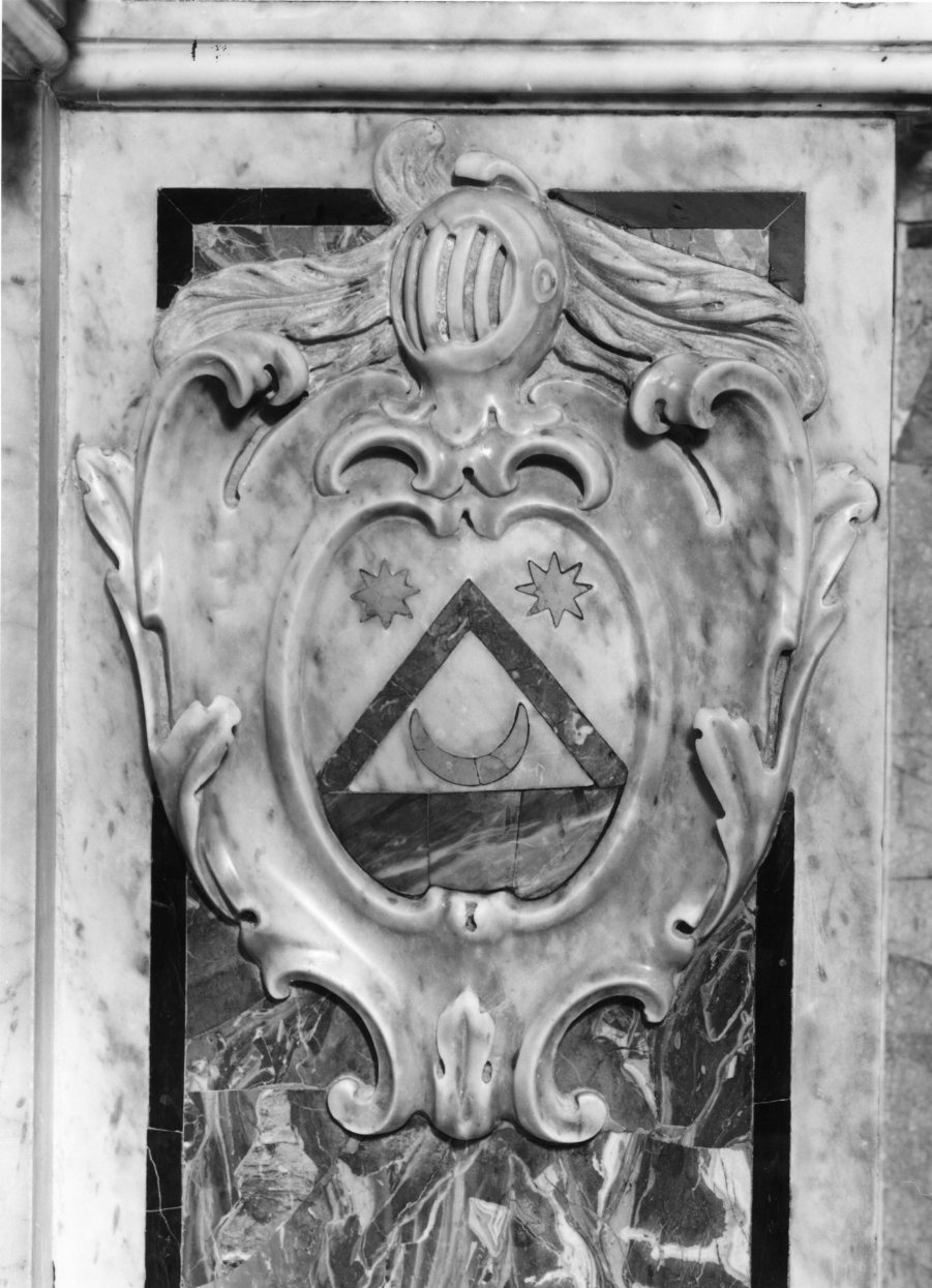 - STEMMI paraste laterali - civile - Stemma - Antonacci Sebastiano Canonico, provicario generale del vescovo [?] - 2 - scudo sormontato da un elmo; nell'arme, piano rosso sormontato da scaglione in campo bianco; nel triangolo crescente montante in giallo; all'esterno dello scaglione due stelle gialle