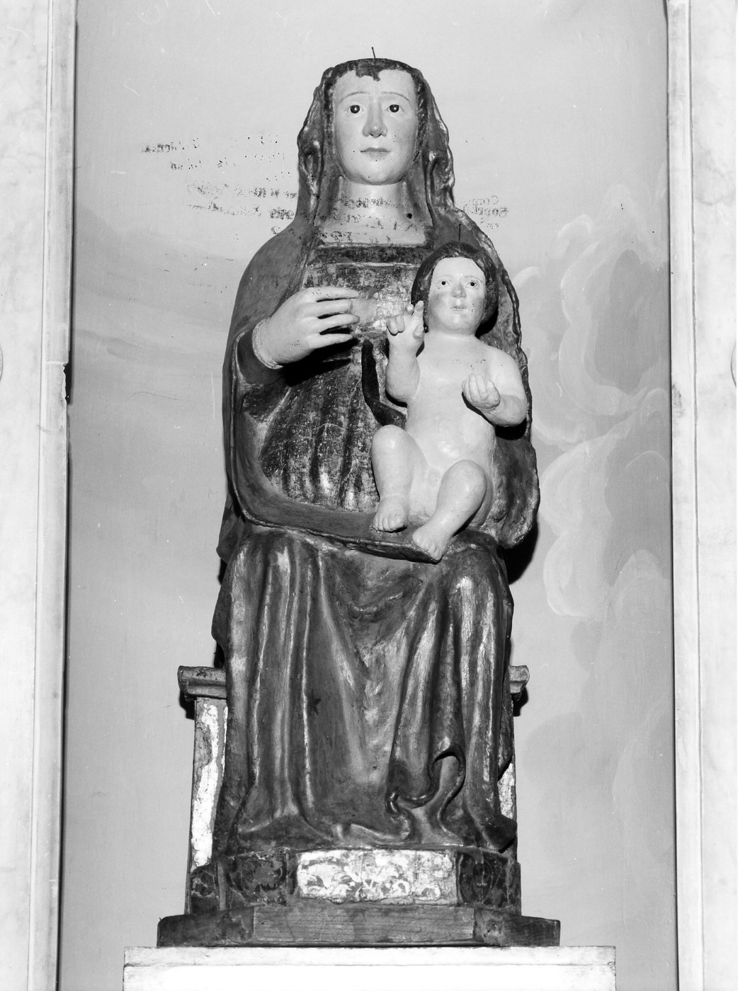 La Madonna, in posizione rigidamente frontale, è seduta su un trono composto da semplice scanno, privo di dossale, su pedana impostata, a sua volta, su base ottagonale. Porta avanti l'avambraccio destro, accostando nella mano l'indice al pollice, e sostiene sulle ginocchia il Bambino, che benedice con la mano destra e solleva la sinistra, con la quale sosteneva probabilmente il globo. Indossa un manto azzurro trapunto di stelle dorate e una tunica dorata, con scollo squadrato, stretta sotto il seno da una cinta. E' mutila della mano sinistra e sul suo capo è stata praticata una risega per la corona