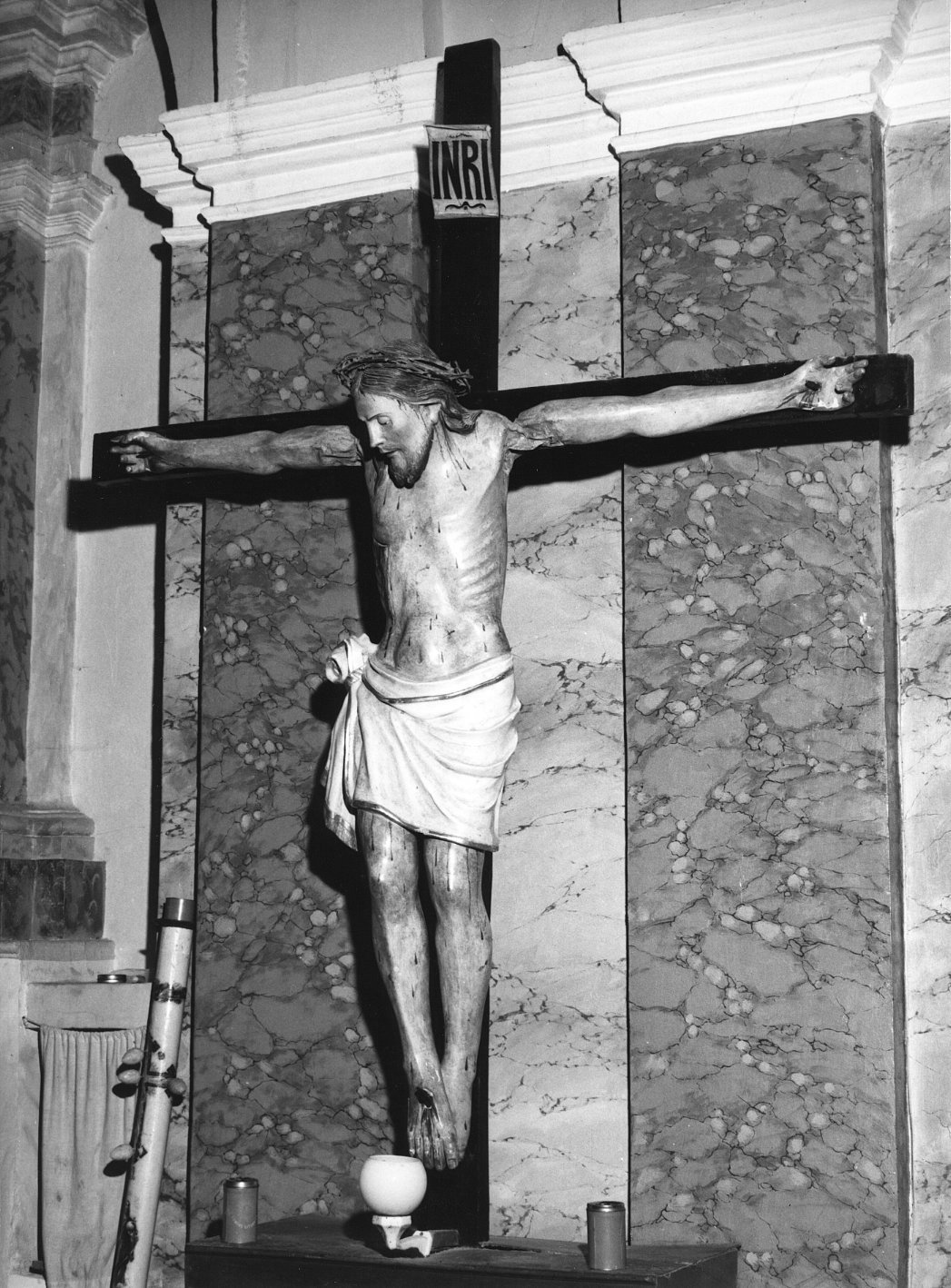 • NOTIZIE STORICO CRITICHE Dalla scheda del 1989: "Le ridipinture e le manomissioni subite dall'opera non permettono una puntuale valutazione critica della figura del Cristo crocefisso, comunque vivacemente modellato.L'opera appare databile al pieno XV sec. ed attribuibile ad un artista di formazione meridionale, forse locale, ancora legato a modelli e stilemi di origine medievali". Dalla scheda del 1973 "Il Crocefisso ha una modellazione naturalistica, priva di stilemi espressivi vivaci, così da essere indotti ad escluderne una datazione consona a riflessi di gusto "barocco" o ad esso posteriore. Peraltro anche un riferimento cronologico cinquecentesco non pare pienamente convincente, specialmente per l'osservazione della falcatura lineare del perizoma