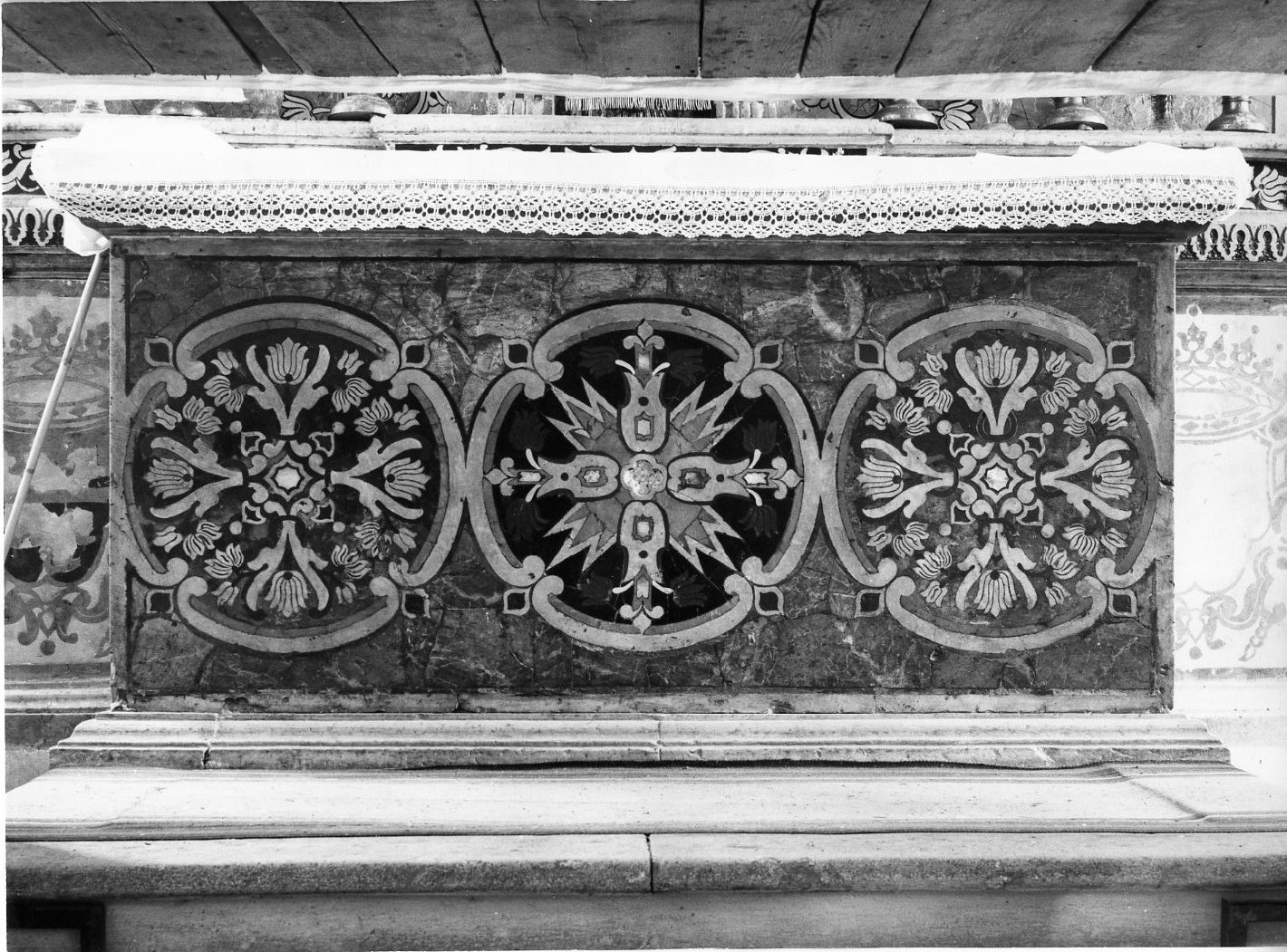 L'altare ha un fronte decorato con tre rosoni intarsiati a motivi vegetali e geometrici; sugli specchi ai lati del paliotto ci sono due stemmi coronati, sugli specchi laterali sono raffigurati vasi con fiori. La mensa è percorsa da un fregio di archetti ad intarsio