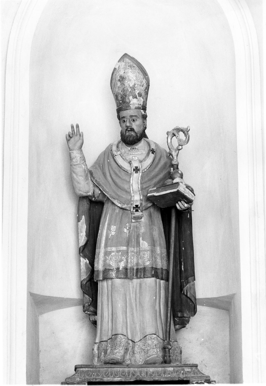 La statua raffigura San Nicola di Bari, con i tradizionali attributi iconografici, frontalmente ed a figura intera. Indossa un piviale giallo foderato di rosso, sopratunica gialla decorata d'oro e tunica chiara con bordo a fiori; è in atto di benedire