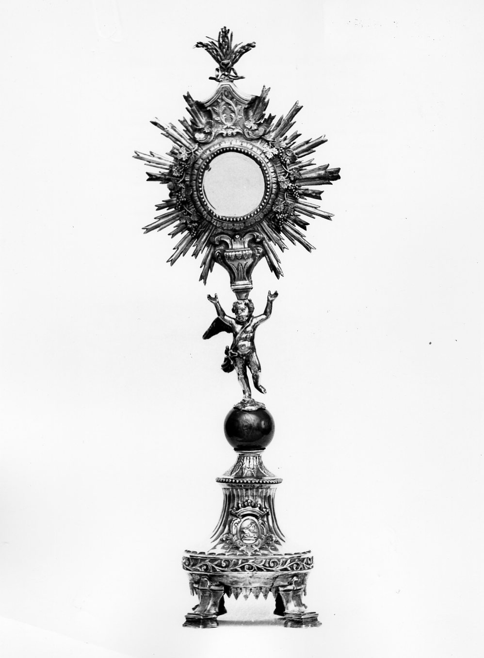 L'ostensorio ha una base circolare con piedini modanati; su questa si inserisce un corpo scanalato con stemma; al di sopra un globo su cui poggia un angelo alato che sostiene con la testa la croce raggiata