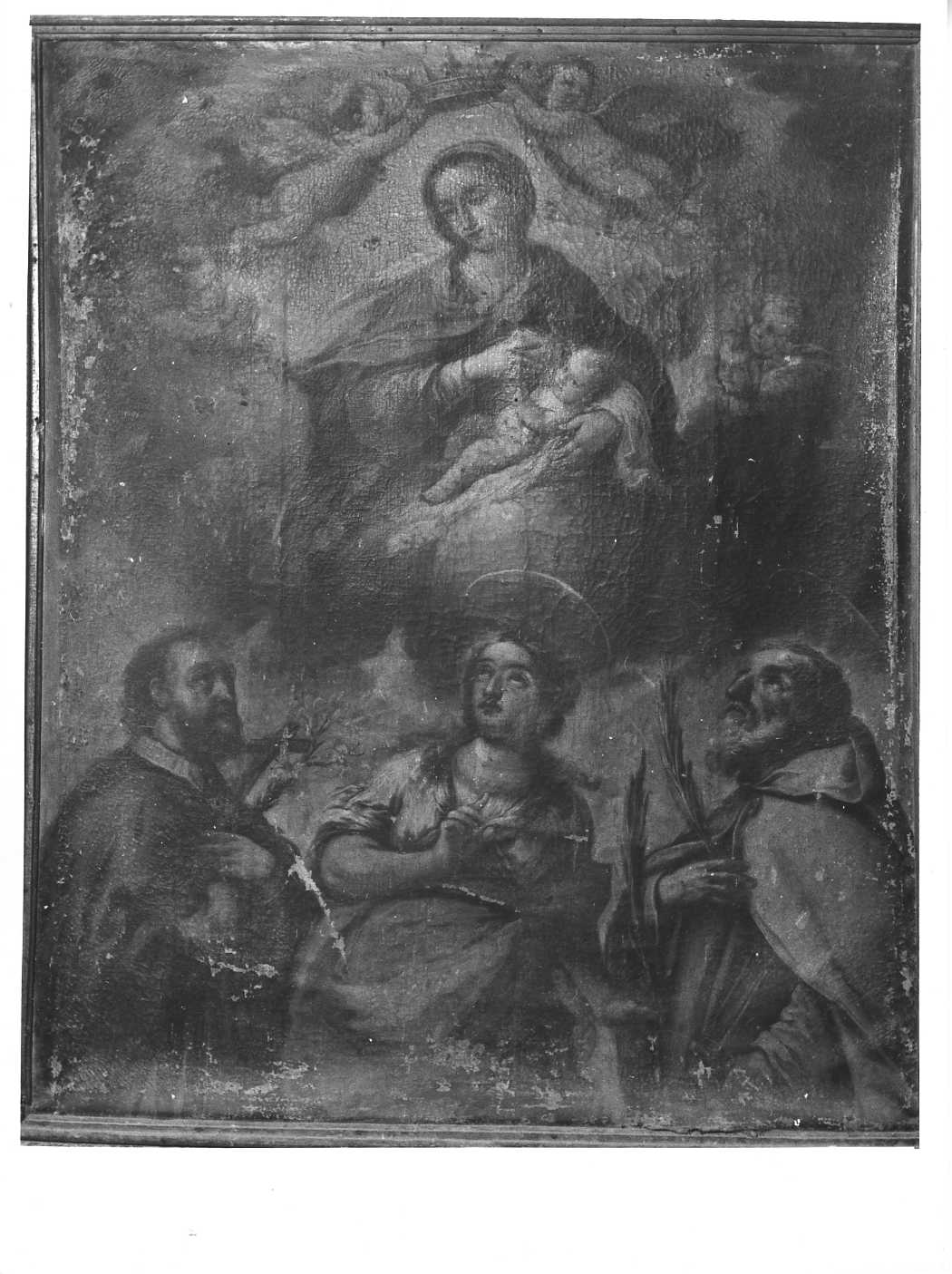 Personaggi: Madonna; Gesù Bambino; San Francesco Saverio; Santa Martire; San Benedetto. Figure: angeli. Attributi: (Madonna) corona; (San Francesco Saverio) croce; (San Francesco Saverio) giglio; (Santa Martire) palma; (San Benedetto) palma. Abbigliamento: religioso