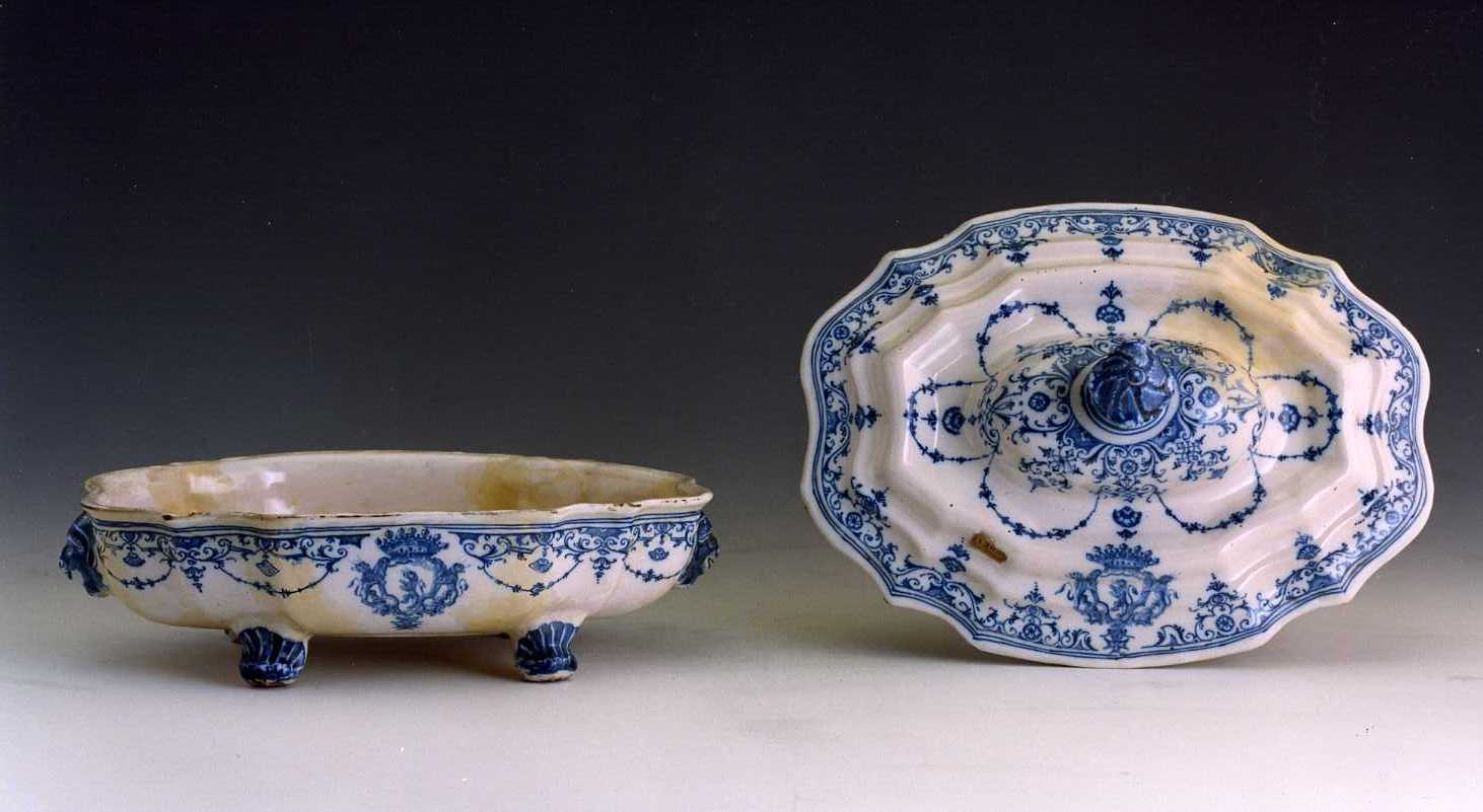 Fondo bianco con decorazione monocroma blu. La base è ornata con festoni e stemma con corona sostenuto da due leoni rampanti e con altro leone rampa nte nel centro. Manici a maschera leonina e piedini zoomorfi in blu. Il co perchio presenta lo stesso ornato arricchito da un pomello blu a forma di fiore
