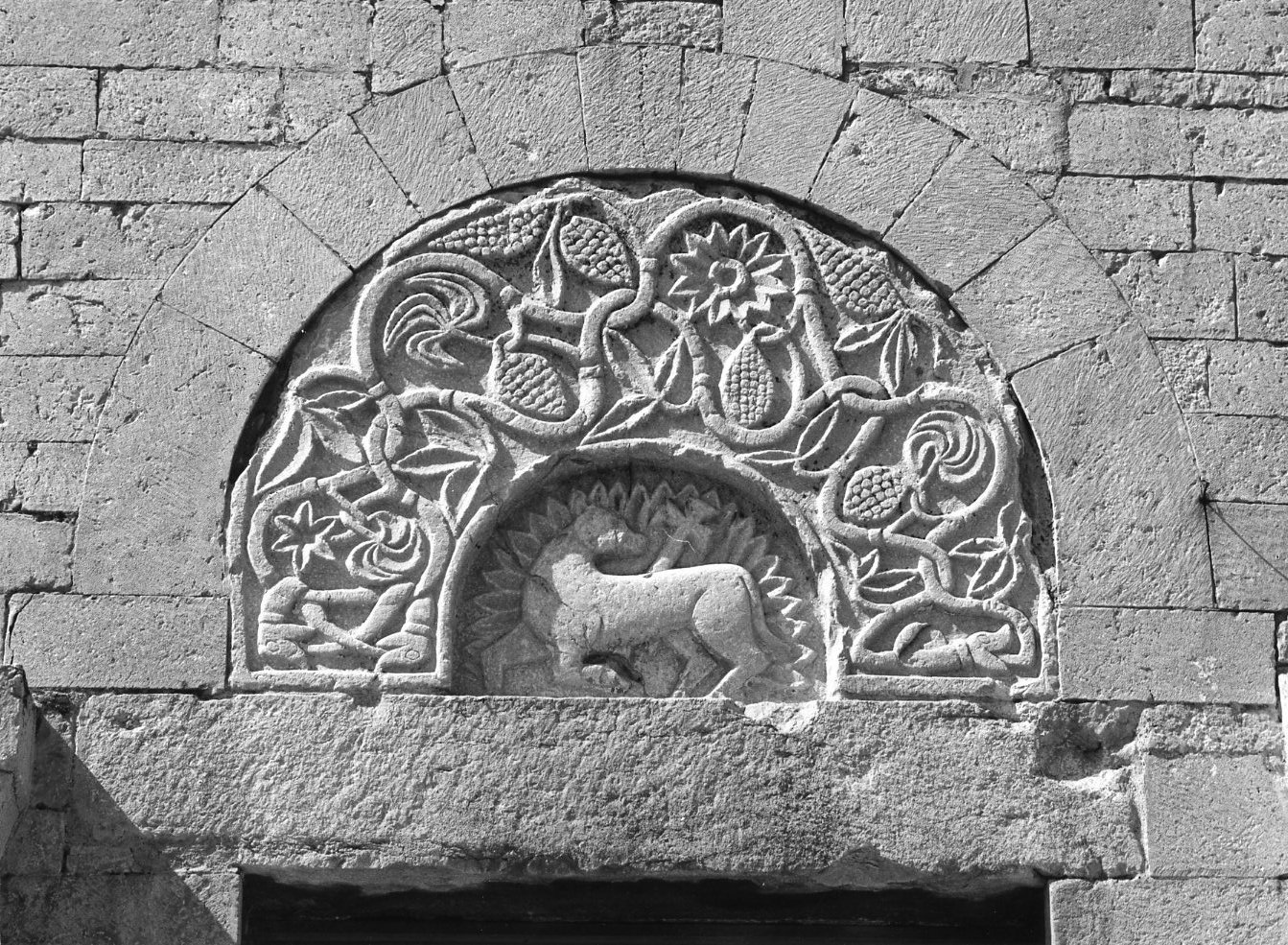 Due racemi d'acanto intrecciati partono da due teste di serpenti e includono -tra i meandri- corolle stellari, foglie, grappoli di uva con foglie. Al centro l'agnello crocifero è circondato da foglie lanceolate