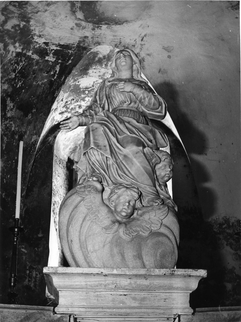 La statua raffigura l'Assunta secondo l'iconografia corrente, con lo sguardo rivolto al cielo. Ai suoi piedi protomi cherubiche