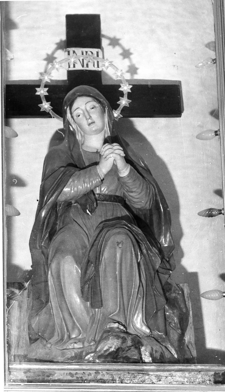 Stauta rafifgurante la Madonna seduta, vestita di una tunica rossa coperta da un manto azzurro. Ha il capo reclinato e le mani giunte. Sullo sfondo, la Croce
