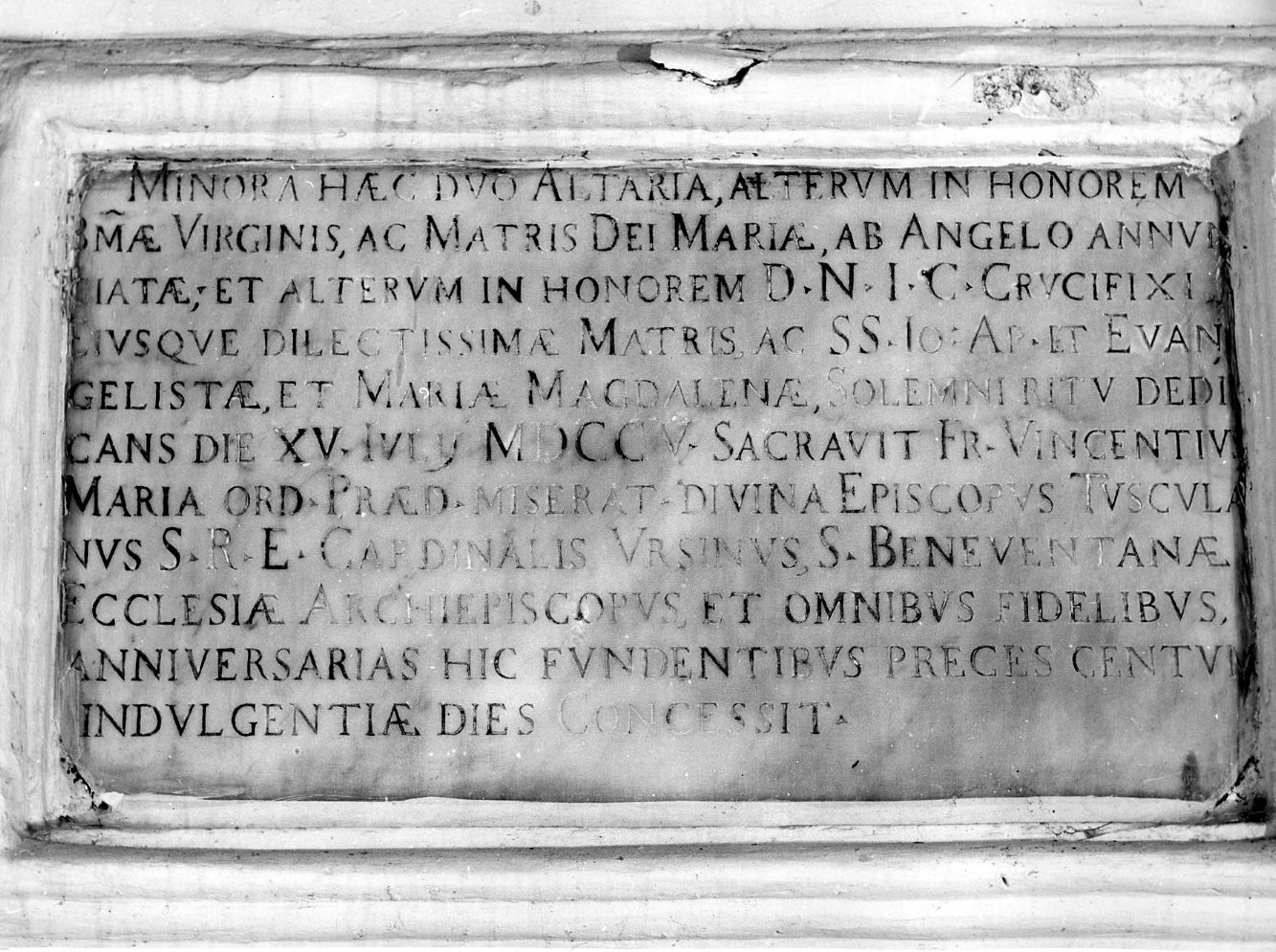 - ISCRIZIONI MINORA HAEC DUO ALTARIA, ALTERUM IN HONOREM/ B MAE VIRGINIS, AC MATRIS DEI MARIAE, AB ANGELO ANNUN/ CIATAE; ET ALTERUM IN HONOREM D.N.I.C. CRUCIFIXI/ EIUSQUE DILECTISSIMAE MATRIS AC SS. IO: AP. ET EVAN/ GELISTAE, ET MARIAE MAGDALENAE, SOLEMNI RITU DEDI/ CANS DIE XV IULIJ MDCCV. SACRAVIT FR.VINCENTIUS/ MARIA ORD.PRAET.MISERAT.DIVINA EPISCOPUS TUSCULA/ NUS S.R.E. CARDINALIS PUSINUS, S. BENEVENTANAE/ ECCLESIAE ARCHIEPISCOPUS, ET OMNIBUS FIDELIBUS,/ ANNIVERSARIAS HIC FONDENTIBUS PRECES CENTUM/ INDULGENTIAE DIES CONCESSIT - lettere capitali -