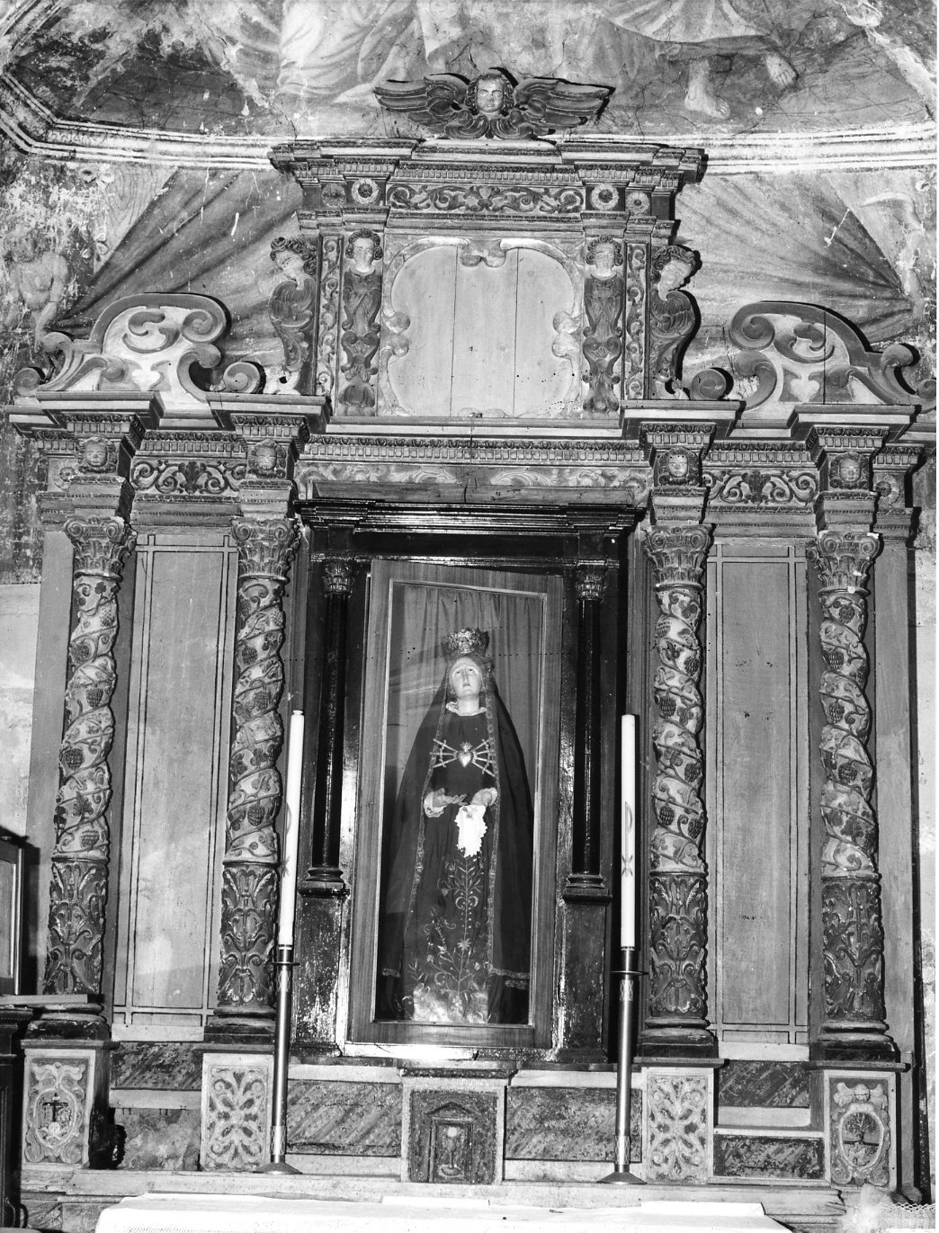Il retablo è scandito da quattro colonnine a tortiglione decorate con tralci di vite concluse in capitelli compositi e pogianti su alte basi. Le due estreme sono ornate da stemmi. Nel registro superiore: scomparto centrale, inserito entro una una ricca cornice con telamoni, sormontati da protome cherubica