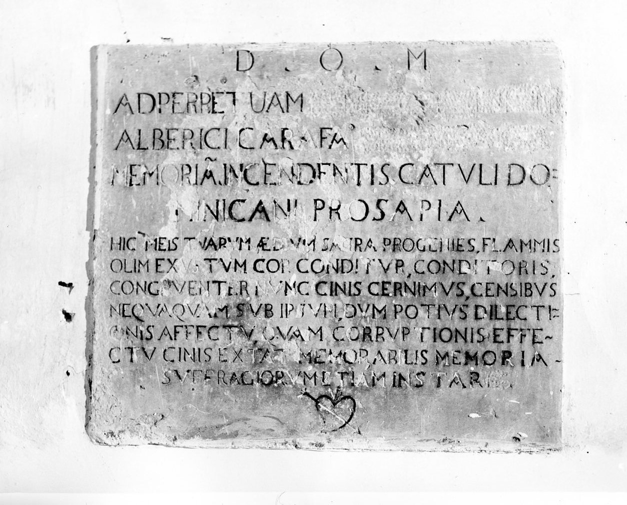 - ISCRIZIONI D.O.M./ AD PERPETUAM[------]/ ALBERICI CARAFA [------]/ MEMORIA INCEDENTIS CATULI DO/ MINICANI PROSAPIA/ HIC MEIS TUARUM AEDIUM SACRA PROGENIES FLAMMIS/ OLIM EXUSTUM COR CONDITUR CONDITORIS/ CONGRUENTER NUNC CINIS SERNIMUS, CENSIBUS/ NAQUAQUAM SUB IPSUM, DUM POTIUS DILECTI=/ ONIS AFFECTU QUAM CORRIPTIONIS EFFE/ CTU CINIS EXTAT MEMORABILIS MEMORIA/ SUFFRAGIORUM ETIAM INSTARE - lettere capitali -