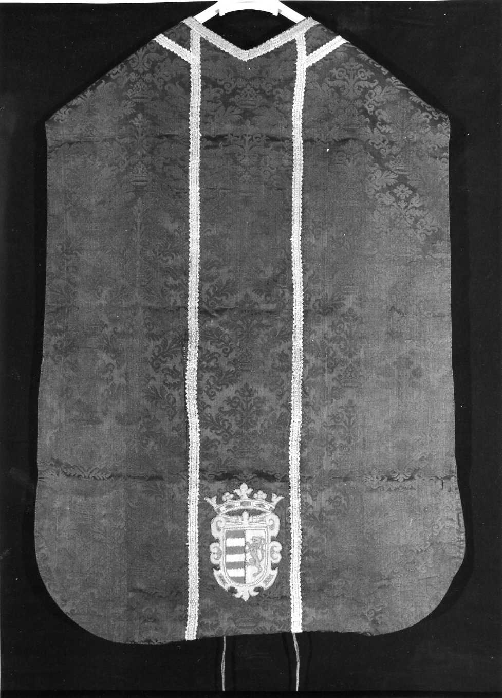 La pianeta in seta damascata verde e galloni dorati, presenta sul fondo della colonna uno stemma bipartito nel cui primo campo i Carafa di rosso a tre fasce di argento e nel secondo i Caracciolo di oro al leone rampante d'azzurro con la coda rivolta in dentro, aramato e linguato di rosso
