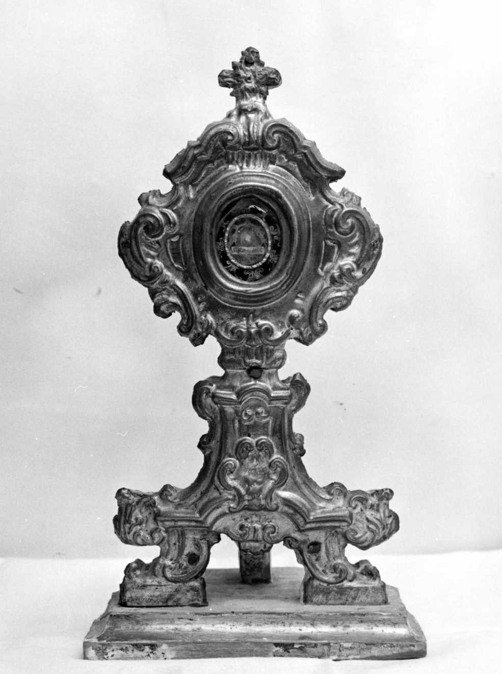 - NOTIZIE STORICO CRITICHE Il reliquiario, che conserva la reliquia di S. Rocco, è certamente una copia di un altro conservato nella chiesa (cfr. NCTN 00009077). Rientra, infatti, nella produzione provinciale di argenteria sacra che ripete i caratteri tecnici e stilistici settecenteschi, ma notevolmente impoveriti nei materiali e nella decorazione. Una cauta ipotesi di datazione, dovuta alla mancanza di bolli, colloca il reliquiario tra il XVII e il XIX secolo