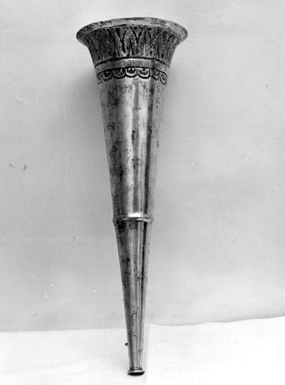 Tromba. Il corpo liscio presenta, a metà circa della sua lunghezza, un anello rigonfio. La svasatura ha una decorazione a palmette, sopra la quale corre l'iscrizione e un motivo di foglie lavorate a cesello