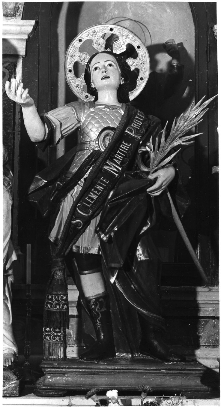 La statua raffigura San Clemente, vestito di una corta tunica, ricoperta dalla corazza, con ai piedi alti calzari, ha il volto sereno, ornato dai capelli scuri e dall'aureola; tiene la mano destra alzata, mentre con la sinistra tiene la palma del martirio e il manto drappeggiato