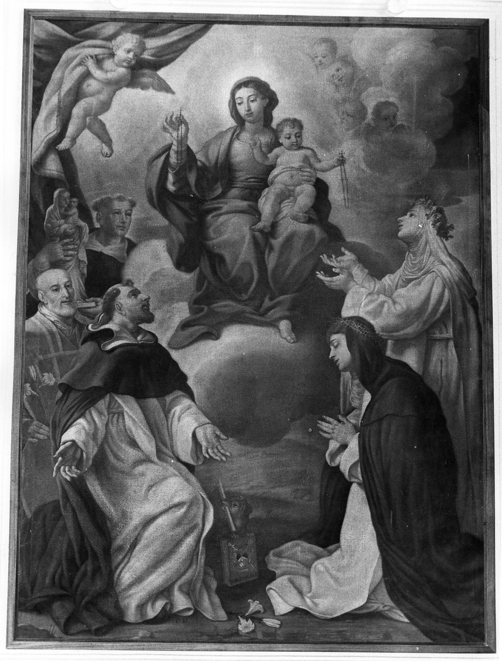 La Madonna, raffigurata secondo l'iconografia tradizionale in atto di porgere un Rosario (anche il Bambino ne porge un altro) è fiancheggiata da una tenda sostenuta da un angelo e da una quinta di nubi e di cherubini. Ai santi collegati tradizionalmente a questa raffigurazione, S. Domenico di Guzman (con il cane che si appoggia al libro con lo stemma del Cardinale Orsini) e S. Caterina da Siena si aggiungono S. Antonio da Padova e S. Filippo Neri a sinistra. A destra S: Rosa da Viterbo. Al centro uno sfondo di paese