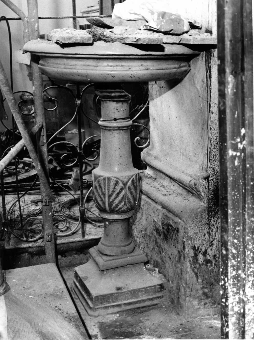 - NOTIZIE STORICO CRITICHE l'acquasantiera, ascrivibile al XVI secolo per la caratteristica sagoma dello stelo, decorato con partito di foglie scolpite e la vasca bassa e ampia, costituisce la più antica testimonianza artistica presente nella Chiesa. E' stata restaurata nel corso del XIX secolo ed integrata con una nuova base, sulla quale resta l'iscrizione di un arciprete non identificato. Sul fondo della vasca, il serpente in rilievo allude alla rigenerazione del Battesimo dopo il peccato