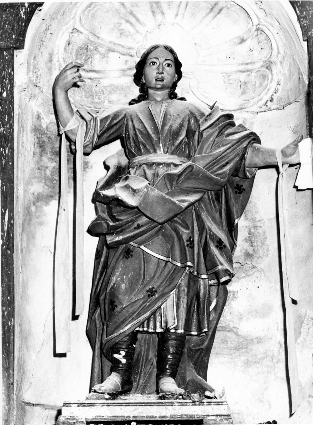 La statua raffigura il Santo con fattezze giovanili e riccamente drappeggiato da un ampio mantello di colore rosso che ammanta parzialmente la veste verde. La posizione del braccio destro fa presumere l' originaria presenza di un bastone o di un vessillo. Era, inoltre, accompagnata dalla statuetta di un angelo. I colori non sono originali, tranne le braccia e il viso. Danneggiata in più punti con ammacature e cadute di colore, la mano destra è mutila del dito medio