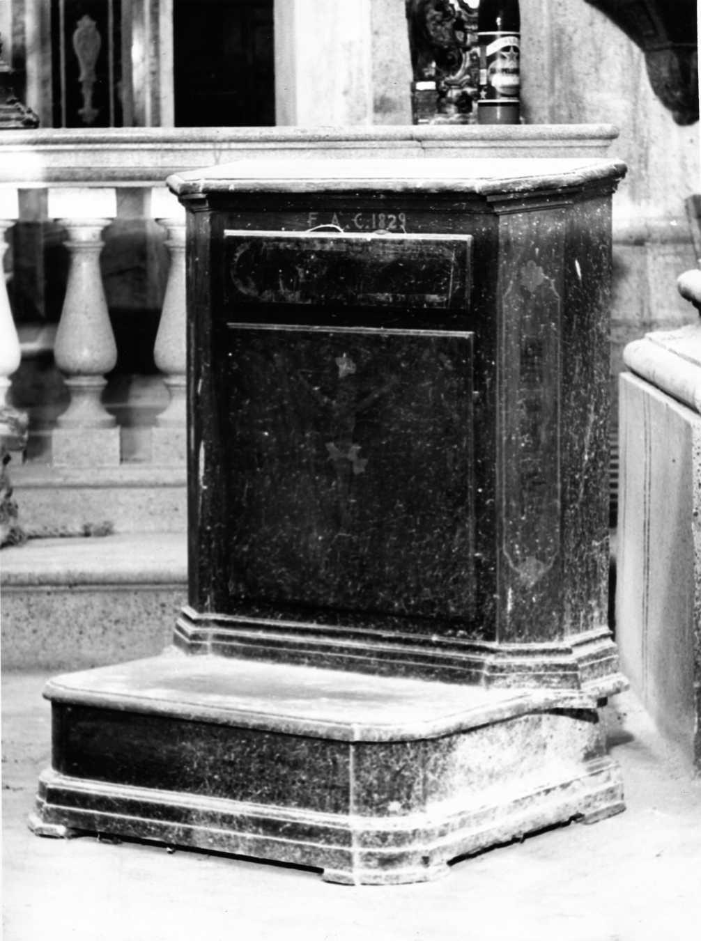 - NOTIZIE STORICO CRITICHE L'intagliatore, non identificato, che ha realizzato l'inginocchiatoio nel 1829, dimostra di conoscere la precedente produzione settecentesca nelle riprese discrete della profilatura del piano d'appoggio, nei sobri motivi a tarsia che sullo sportello raffigurano il Crocifisso con legni di tonalità diversa. Solo una pulitura accurata permetterà di valutare le qualità del mobile