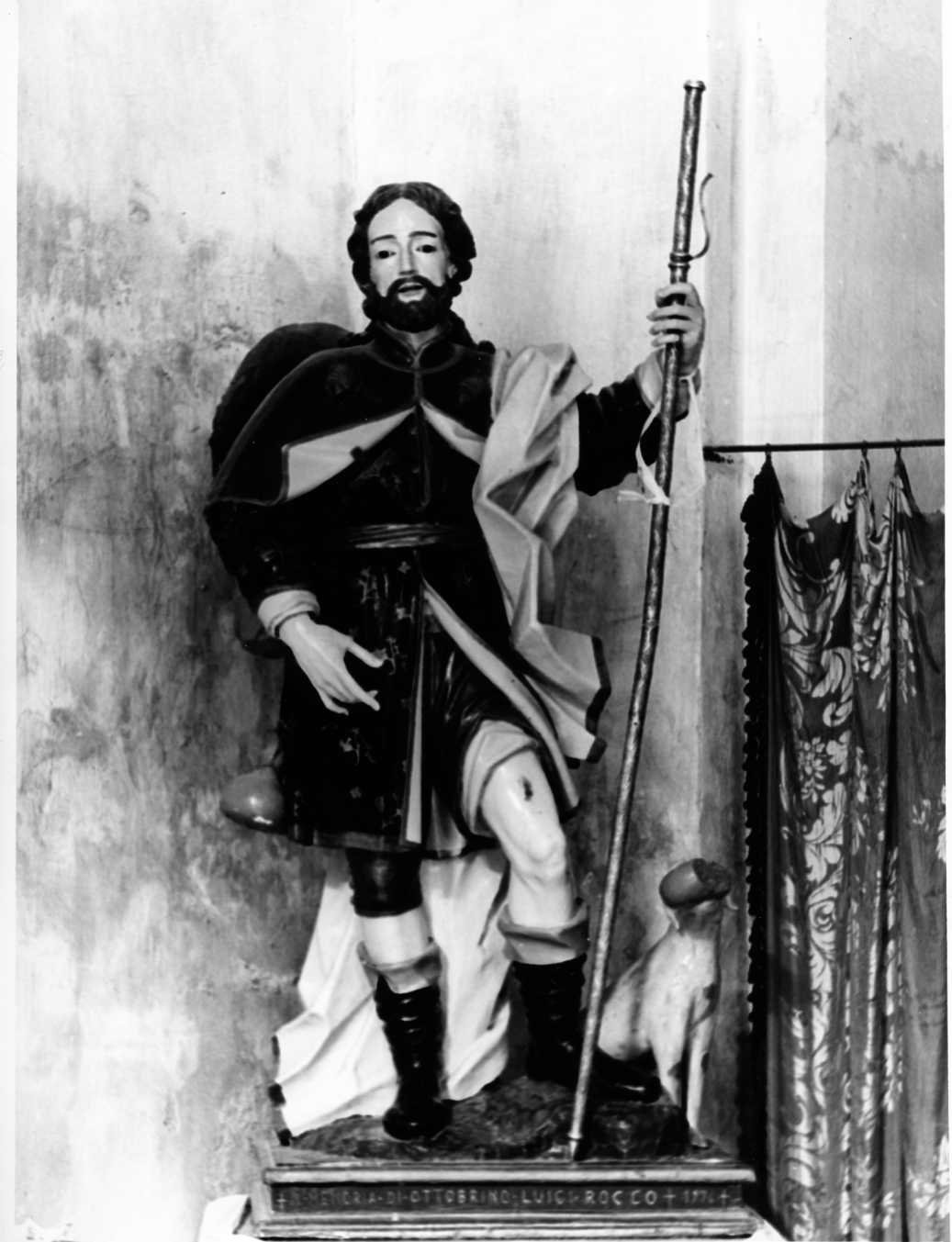 Il Santo è raffigurato con i consueti attributi da pellegrino, ai suoi piedi il cane con mezzo pane tra i denti. Con la mano destra San Rocco indica la gamba infetta, con la sinistra stringe il bastone d'argento. La scultura è totalmente ridipinta