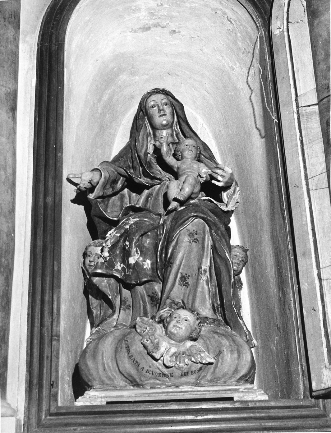 La Madonna con il Bambino appoggiato su una gamba (applicato su un perno m etallico) siede su nuvole, con testine di angelo. La Madonna ha manto azzu rro e veste bianca