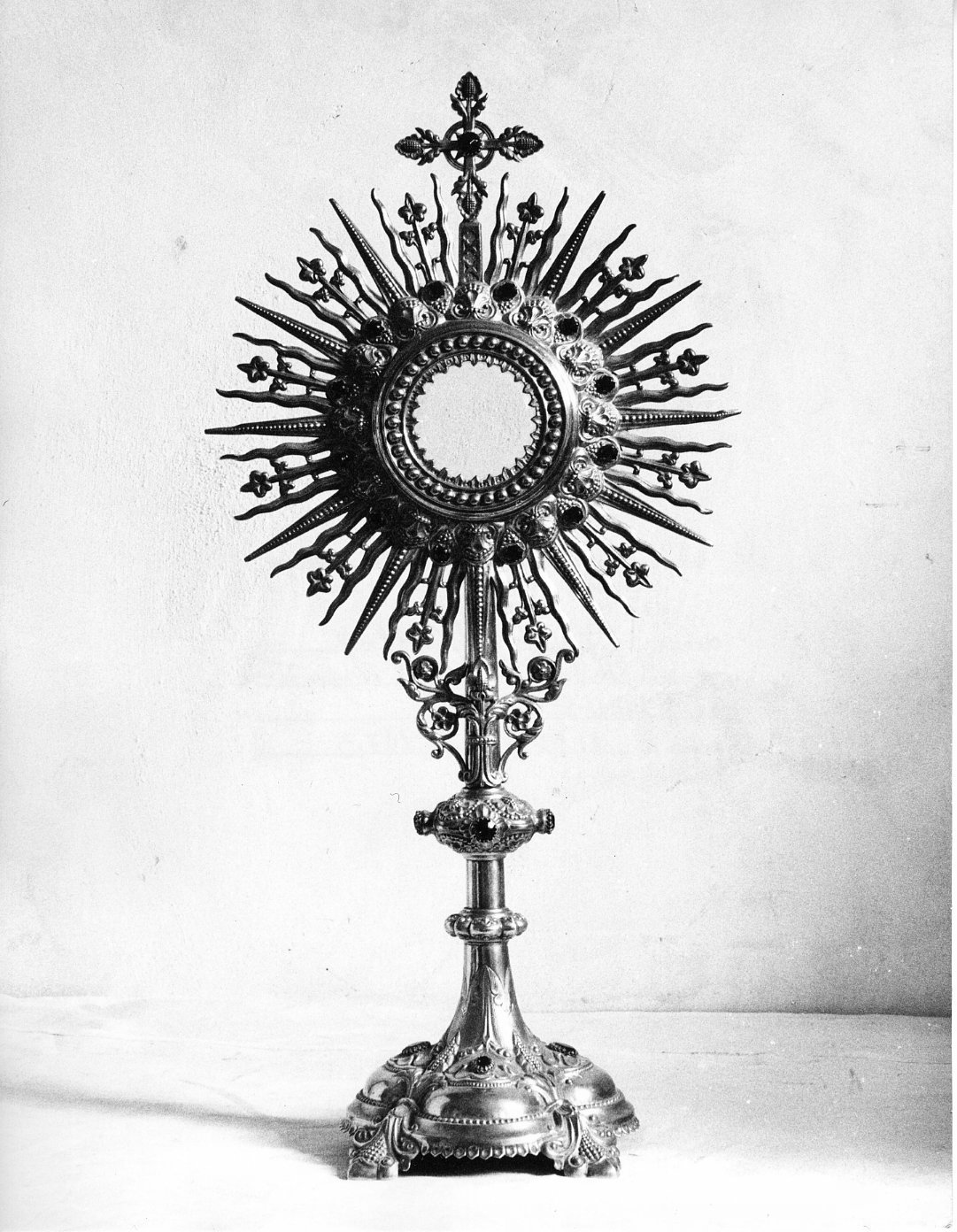 - NOTIZIE STORICO CRITICHE Esemplare interessante di orificeria "fin de siècle", raro in provincia. L'acquisto avvenne fra il primo e il secondo decennio del secolo scorso (com. orale del parroco). Un ostensorio simile, datato al 1887, anch'esso di origine francese, è conservato nella cattedrale di Narni (cfr. Arredi sacri nella diocesi di Terni, Narni e Amelia, Roma 1974, n.126, catalogo della mostra a cura di M. D'Onofrio). Si propone pertanto per questo esemplare analoga datazione