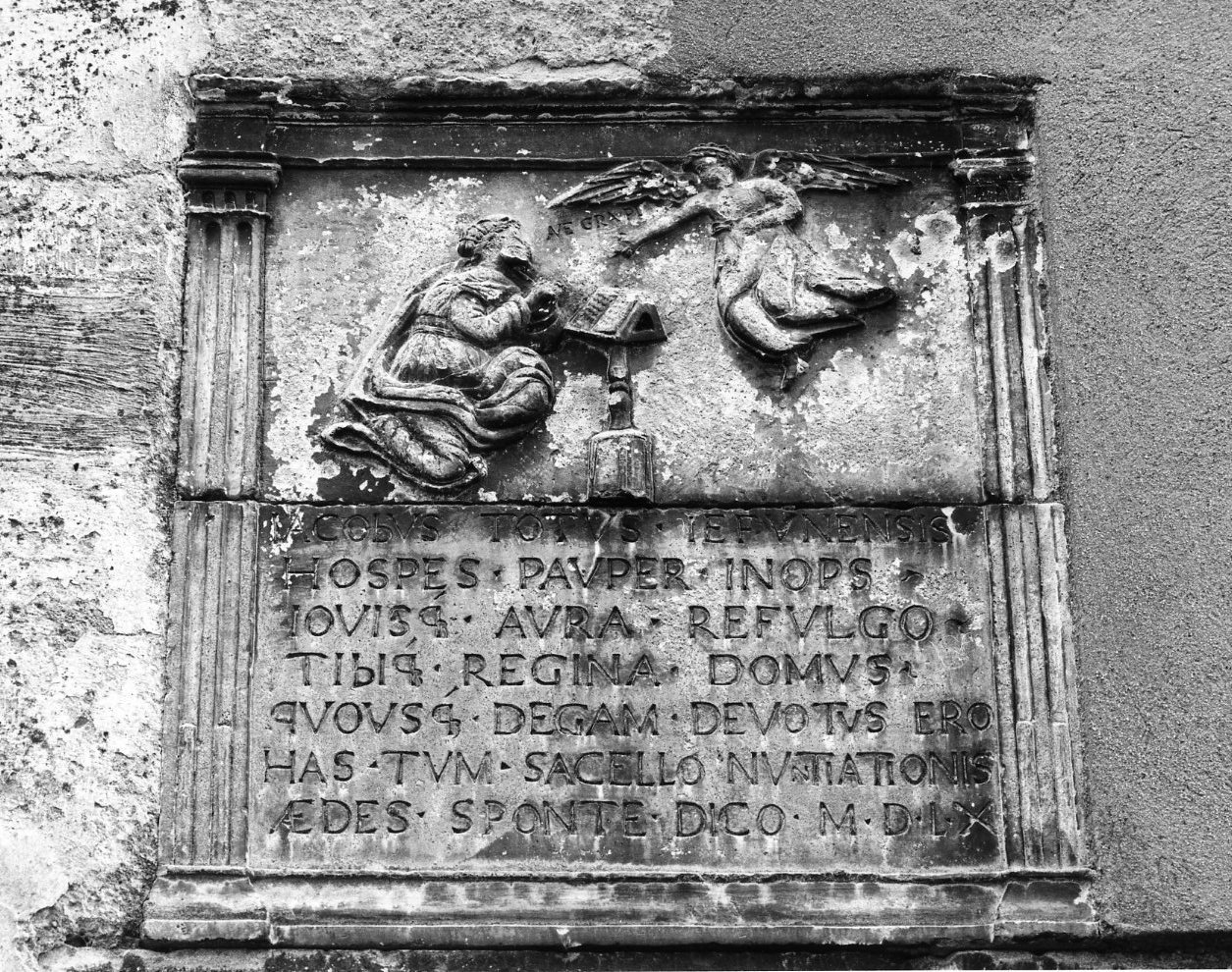 - NOTIZIE STORICO CRITICHE Come si legge nell'iscrizione, il bassorilievo e l'edificio nel qule questo venne murato, sono sttai dedicati nel 1560 "al sacello dell'Annunciazione" da Jacopo Toti di Giffoni, "straniero, misero, povero", ma ora splendente "nell'ansa di Giove"