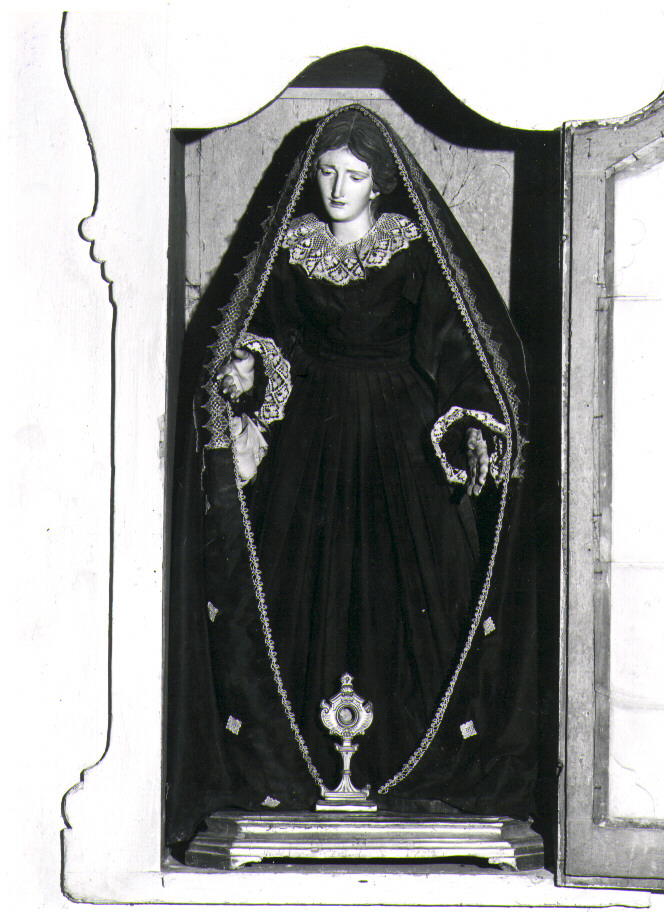 - NOTIZIE STORICO CRITICHE L'opera riassume in sé i caratteri della statua e del manichino: come la prima è interamente scolpita e, come il secondo, indossa abiti veri. Tali caratteri, uniti alle piccole dimensioni della scultura, risultano dettatida evidenti ragioni pratiche (la possibilità di trasportare, durante le processioni pubbliche, oggetti devozionali che non pesassero troppo) e di risparmio (la realizzazione è più curata nelle parti in vista). Opera di discreta fattura artigianale (si veda la cura posta nella realizzazione dell'espressione di dolore intenso, ma, ad un tempo, contenuto, misurato) è riconducibile al repertorio delle analoghe sculture molisane del secolo XVIII