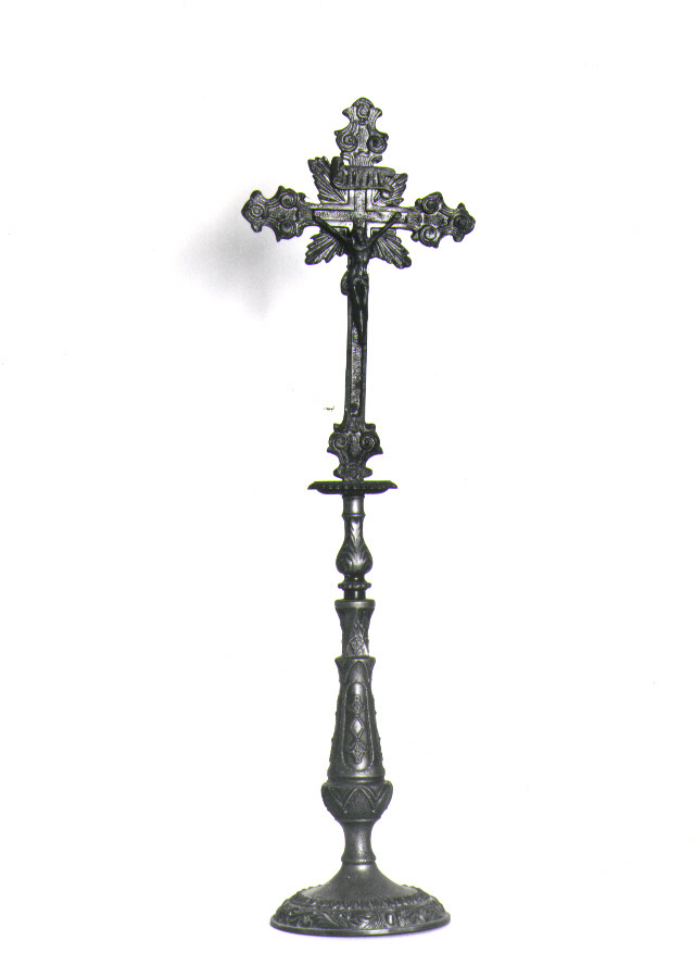 Croce d'altare con piedistallo con base e sommità circolari; fusto a più nodi; bracci: bordati da cornice rettilinea, estremità sagomate a volute; raggi a incrocio dei bracci